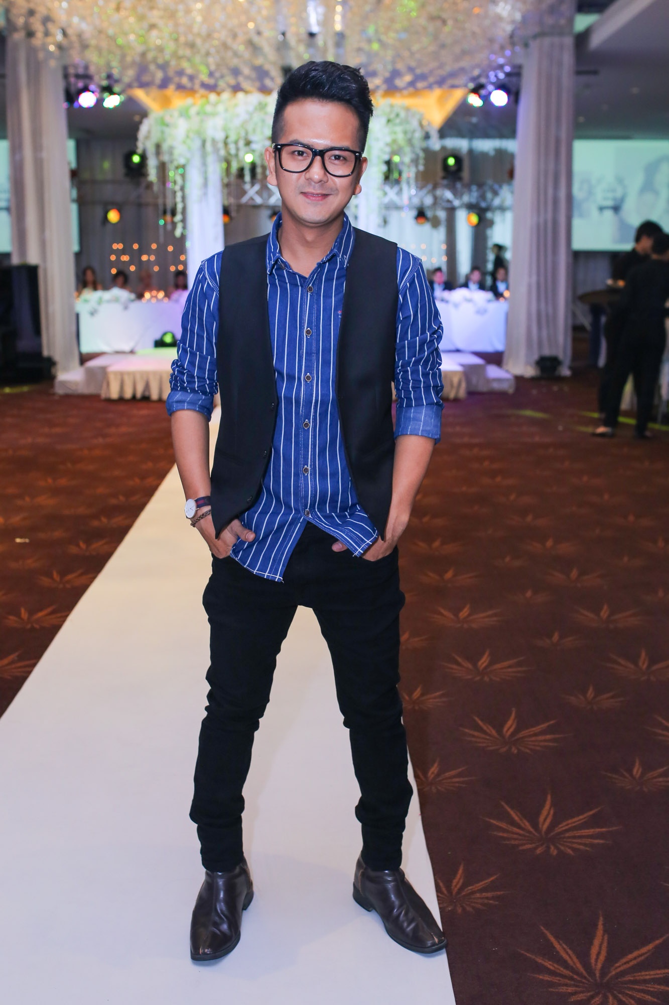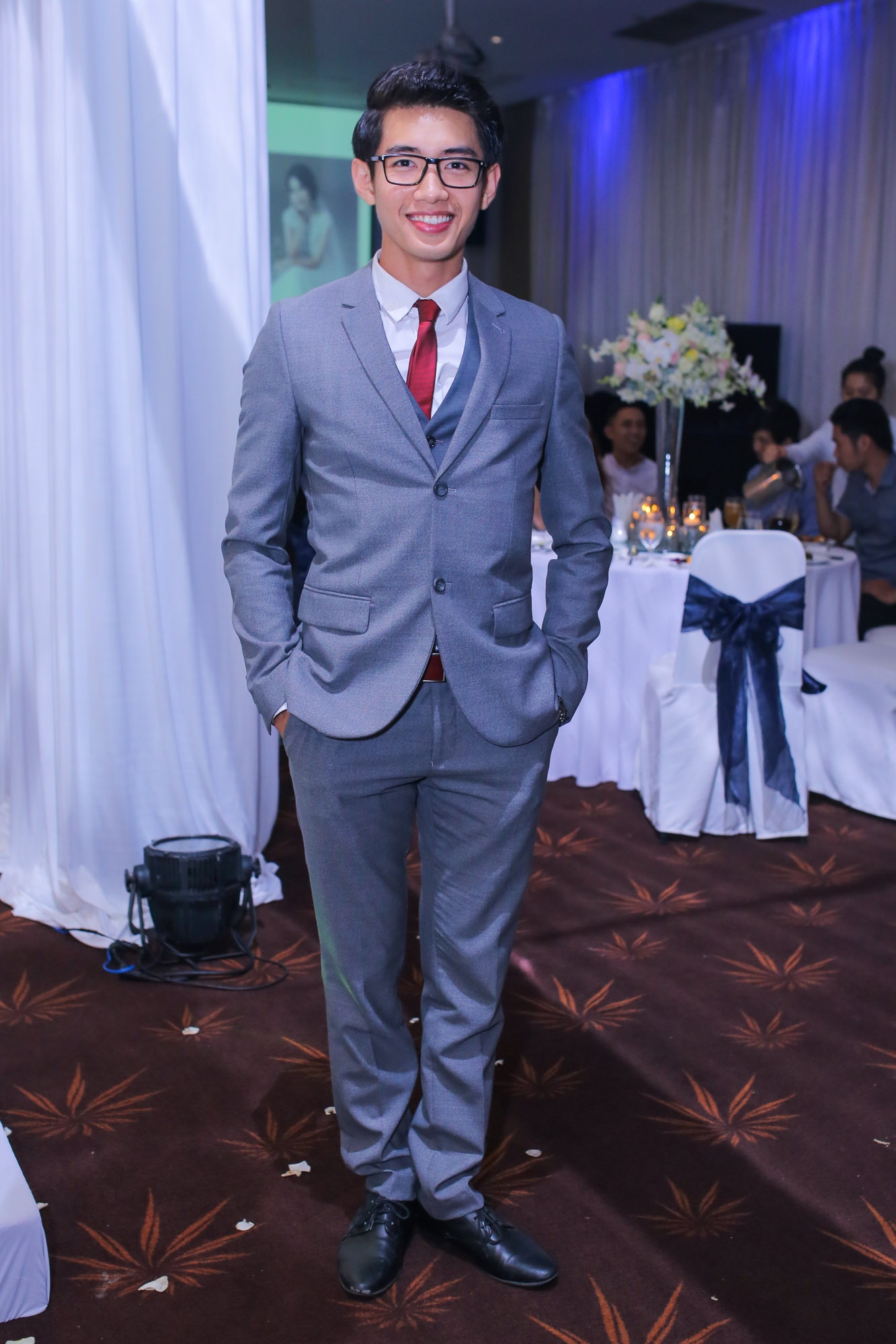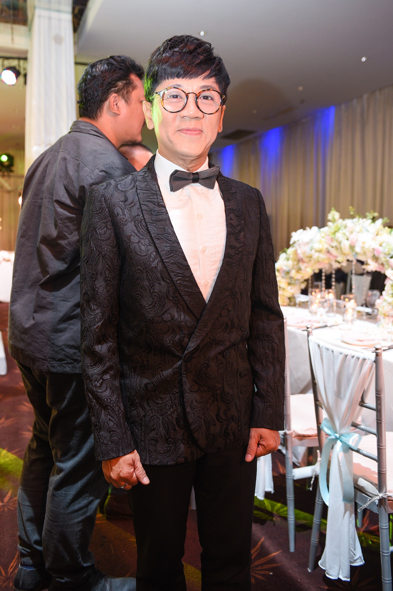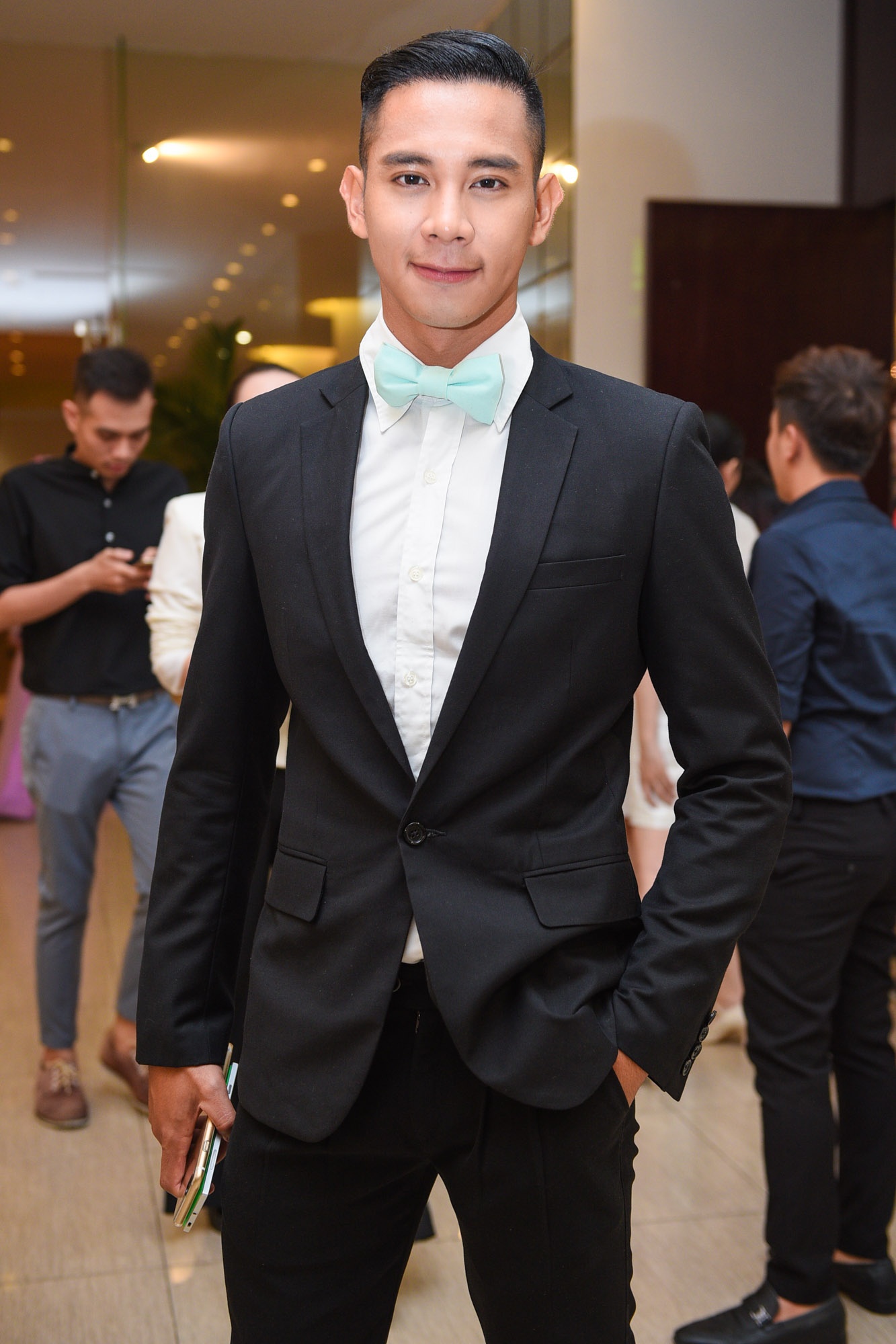 | Hồ Vĩnh Khoa trông trẻ trung hơn nhờ điểm nhấn nơ áo xanh pastel. Anh thân thiết với cô dâu từ thuở cả hai chập chững gia nhập giới giải trí. |