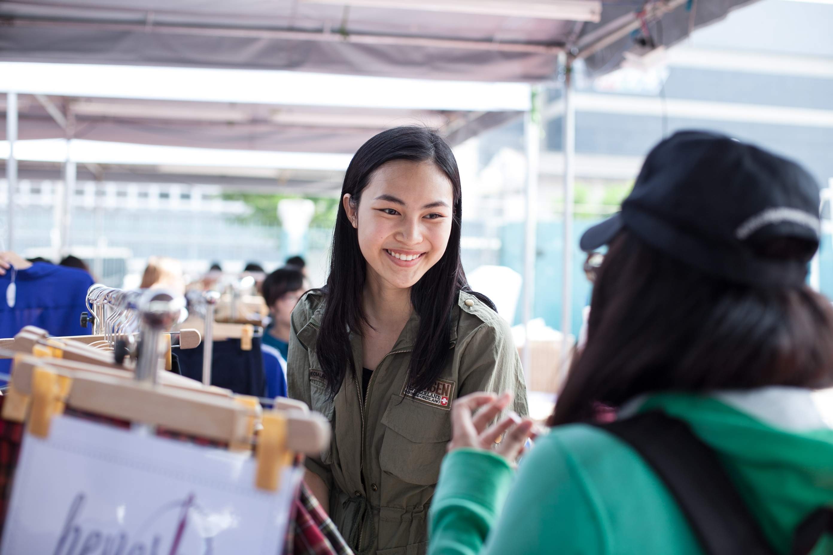 Á hậu Hoàng Oanh mặc phong cách khi đến hội chợ.