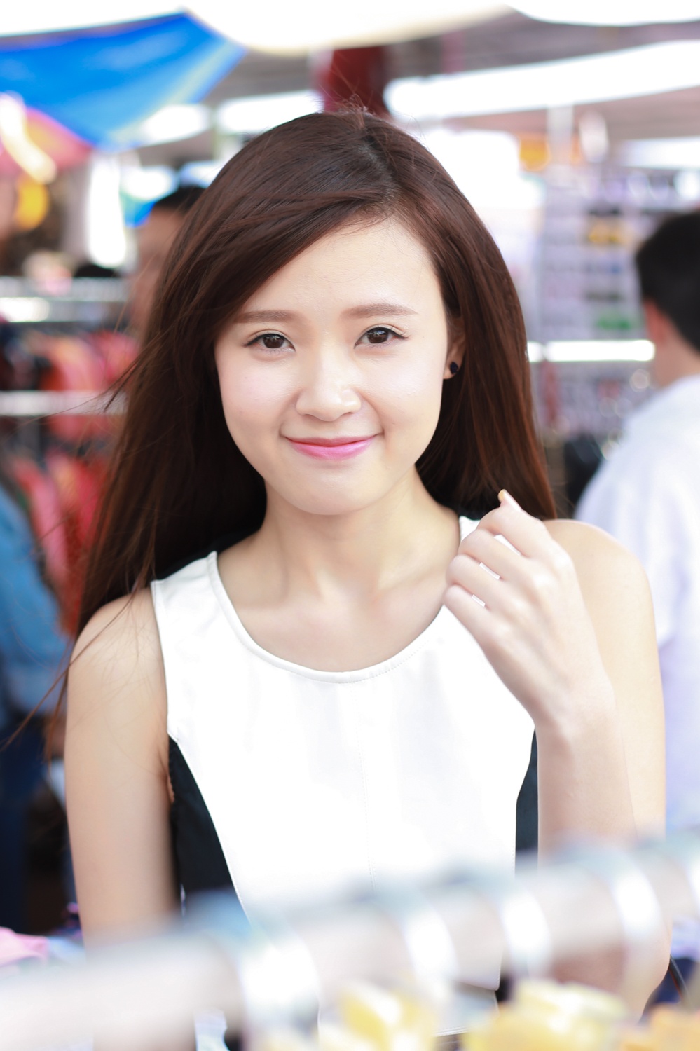 | Midu thích thú chọn những trang phục đơn giản, hợp với phong cách thời trang bình dân của bản thân. Cô trang điểm nhẹ nhàng và mặc giản dị. Midu được nhiều khán giả nhận ra khi đến hội chợ mua hàng. |