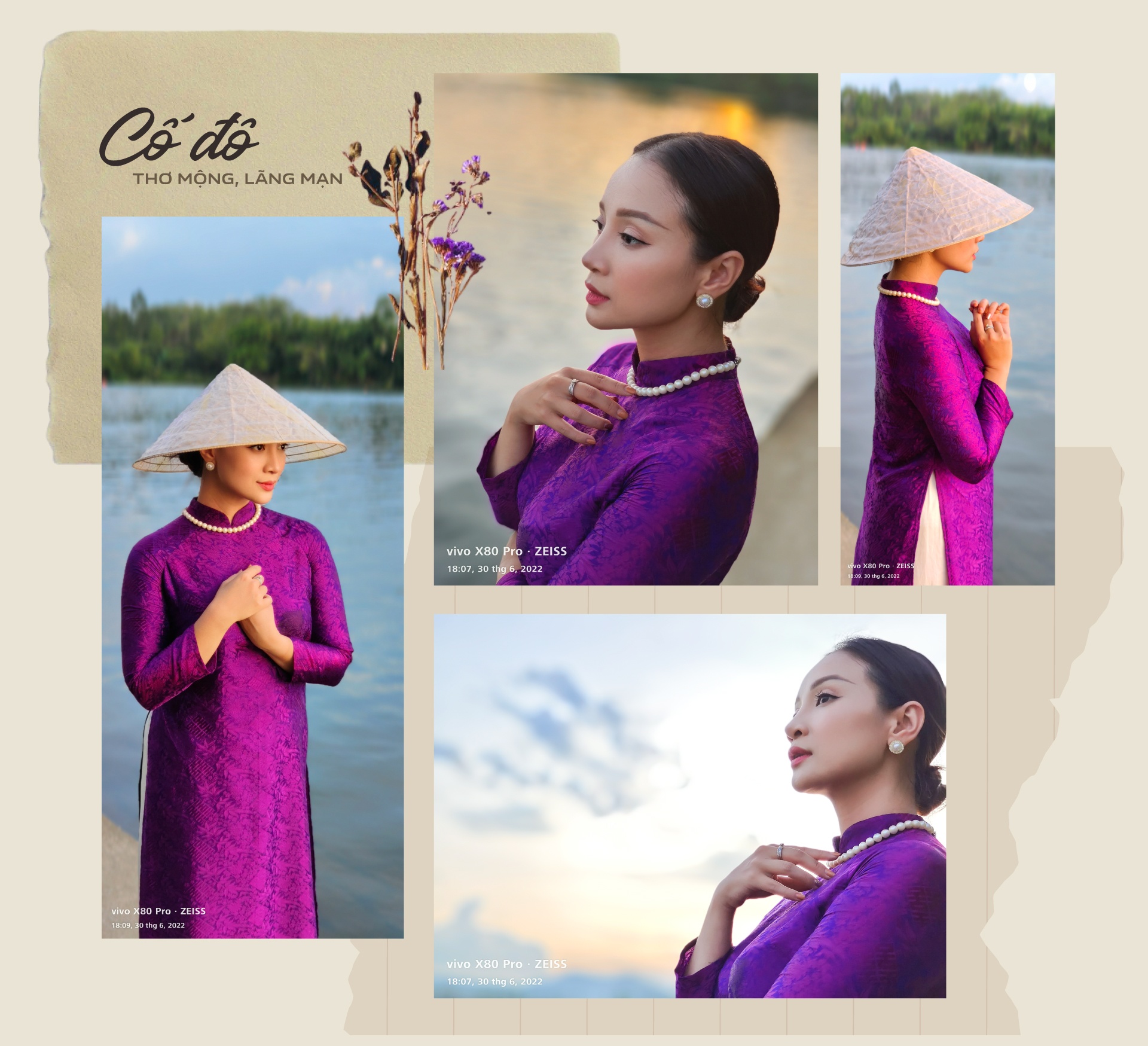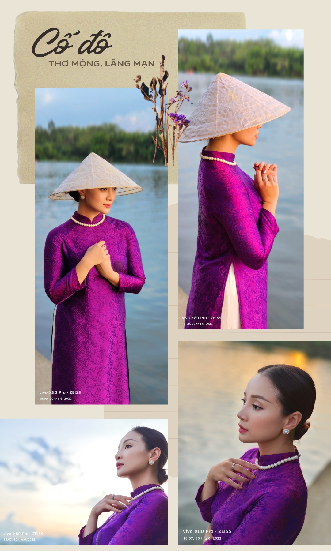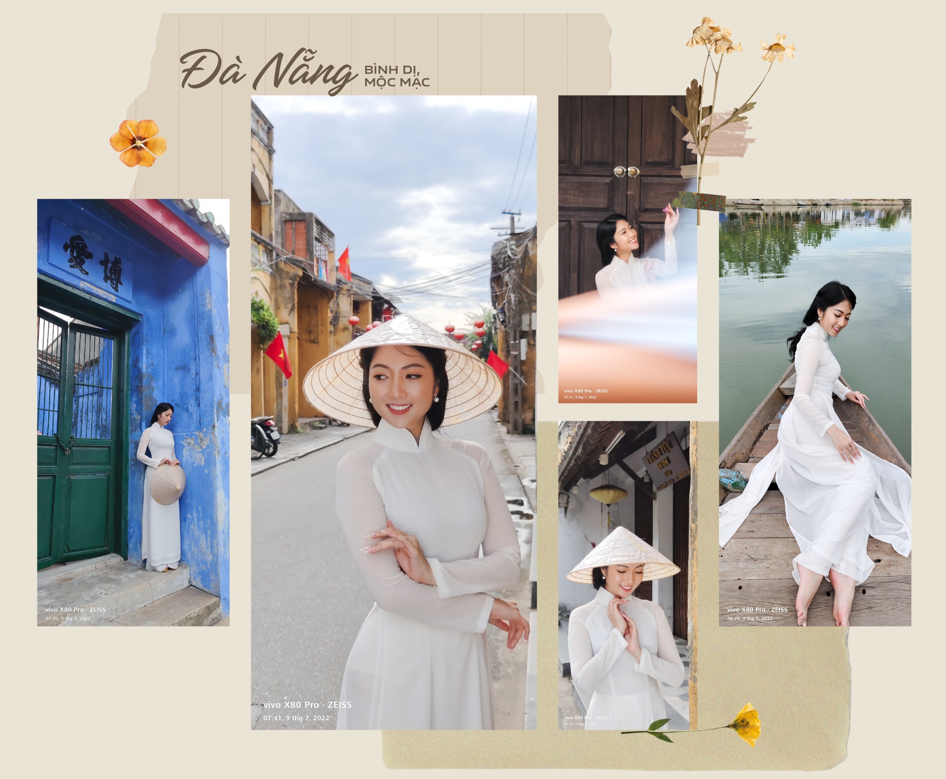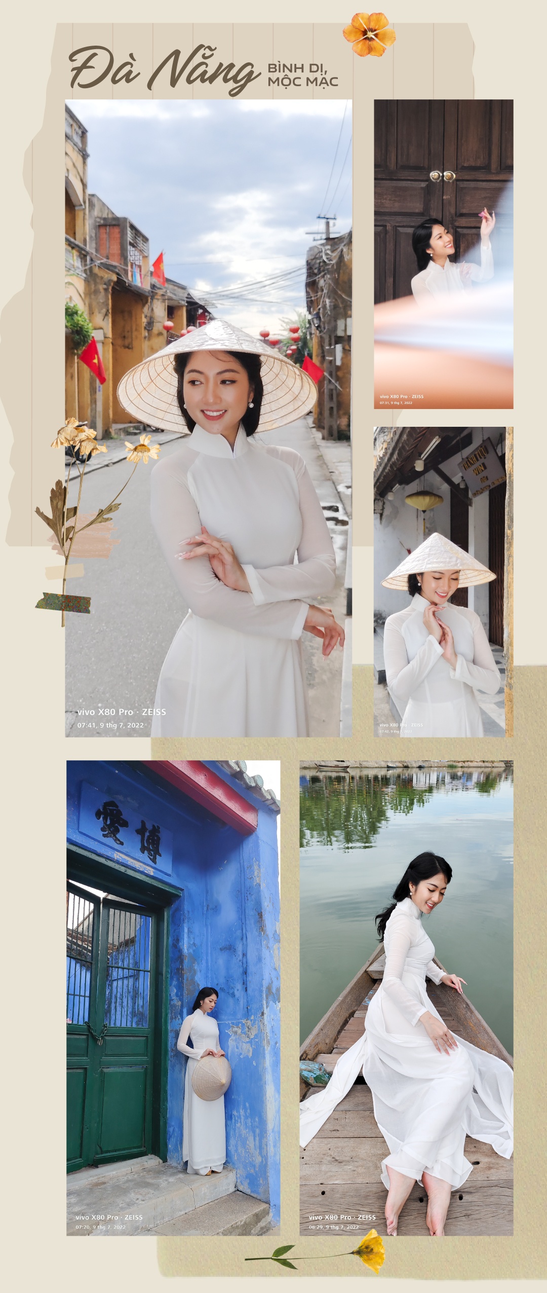 Trong khi Huế làm say lòng du khách bởi tà áo dài tím mộng mơ, thì Hội An khiến người ta đến lưu luyến bởi tà áo dài trắng tinh khôi. Khung cảnh hoài niệm của phố cổ giúp người con gái phố hội trong tà áo dài và nón lá càng thêm đằm thắm, duyên dáng. Hình ảnh thân thương này cũng được bắt trọn bởi chế độ siêu chân dung ZEISS của vivo X80 Pro.