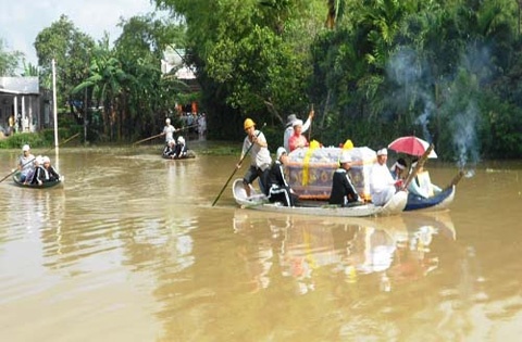 | Do nước lũ chia cắt làm cho việc đi lại của người dân các xã khu Đông Tuy Phước gặp nhiều khó khăn. Trong ảnh, một đám tang tại thôn Huỳnh Mai, xã Phước Nghĩa phải dùng sõng để đưa tang. |