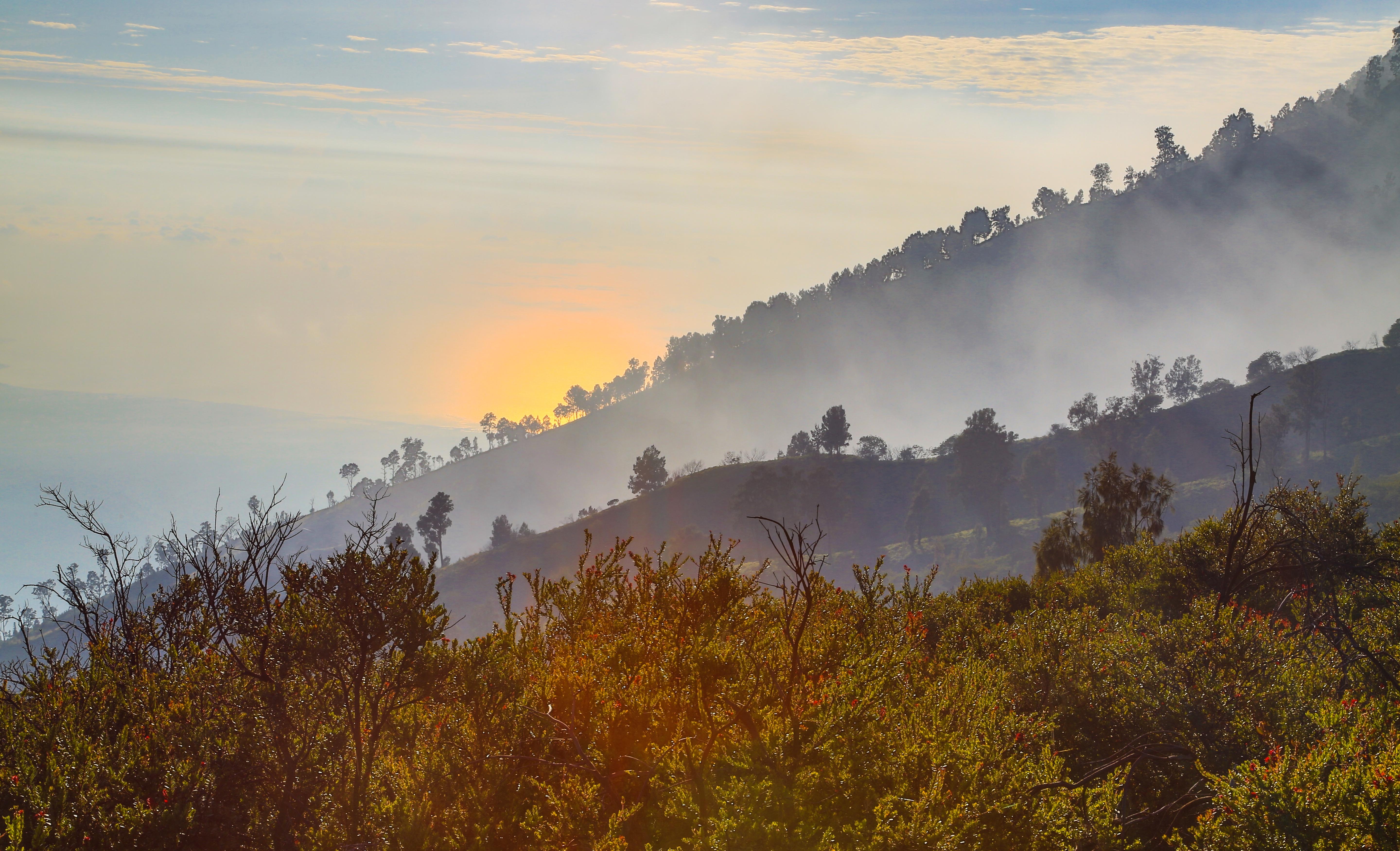 “Blue Fire” không phải là lý do duy nhất để du khách mọi nơi khởi hành đi Ijen lúc nửa đêm. Bình minh trên miệng núi lửa và sự biến đổi màu sắc trong buổi sớm mai của một trong những hồ a xít lớn nhất thế giới là những khoảnh khắc đẹp và hùng vĩ hiếm có. Mặt trời bắt đầu lấp ló phía đông chậm rãi xua tan làn sương mờ ảo, để lộ ra hàng cây lá kim mọc san sát bên triền núi, nhân tiện tô thêm vô vàn sắc cam đỏ trên nền trời rộng lớn. Hồ Ijen dần hiện lên với màu xanh lơ nhàn nhạt, như một mảng màu lớn đang loang dần trên bảng vẽ.