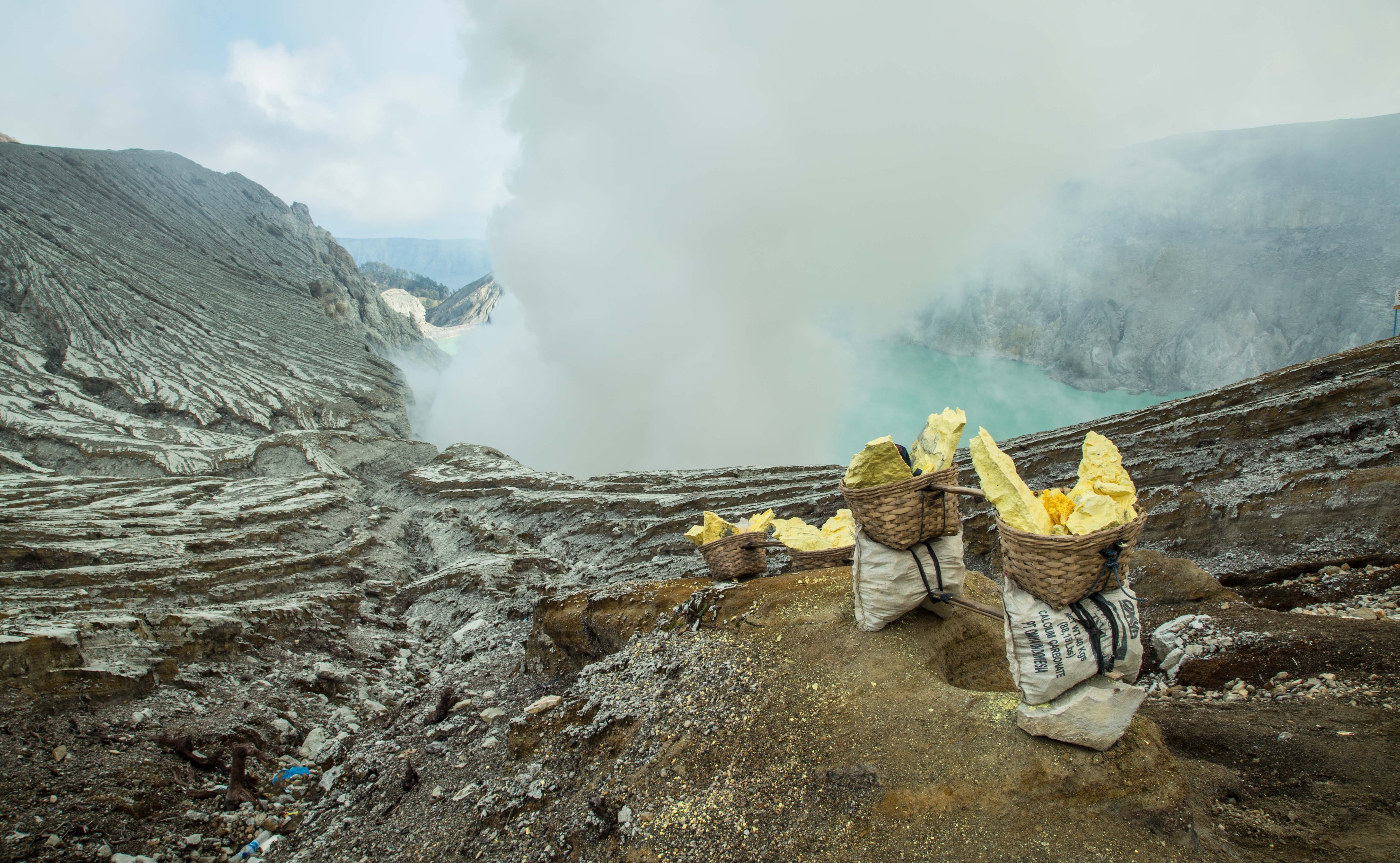 | Hầu hết tất cả những người thợ mỏ ở Ijen vận chuyển 2 chuyến trong một ngày. Một nhà máy đường gần đó trả công cho họ dựa vào trọng lượng quặng lưu huỳnh mà họ vận chuyển được trong một ngày, trung bình khoảng 13 đô la Mỹ. |