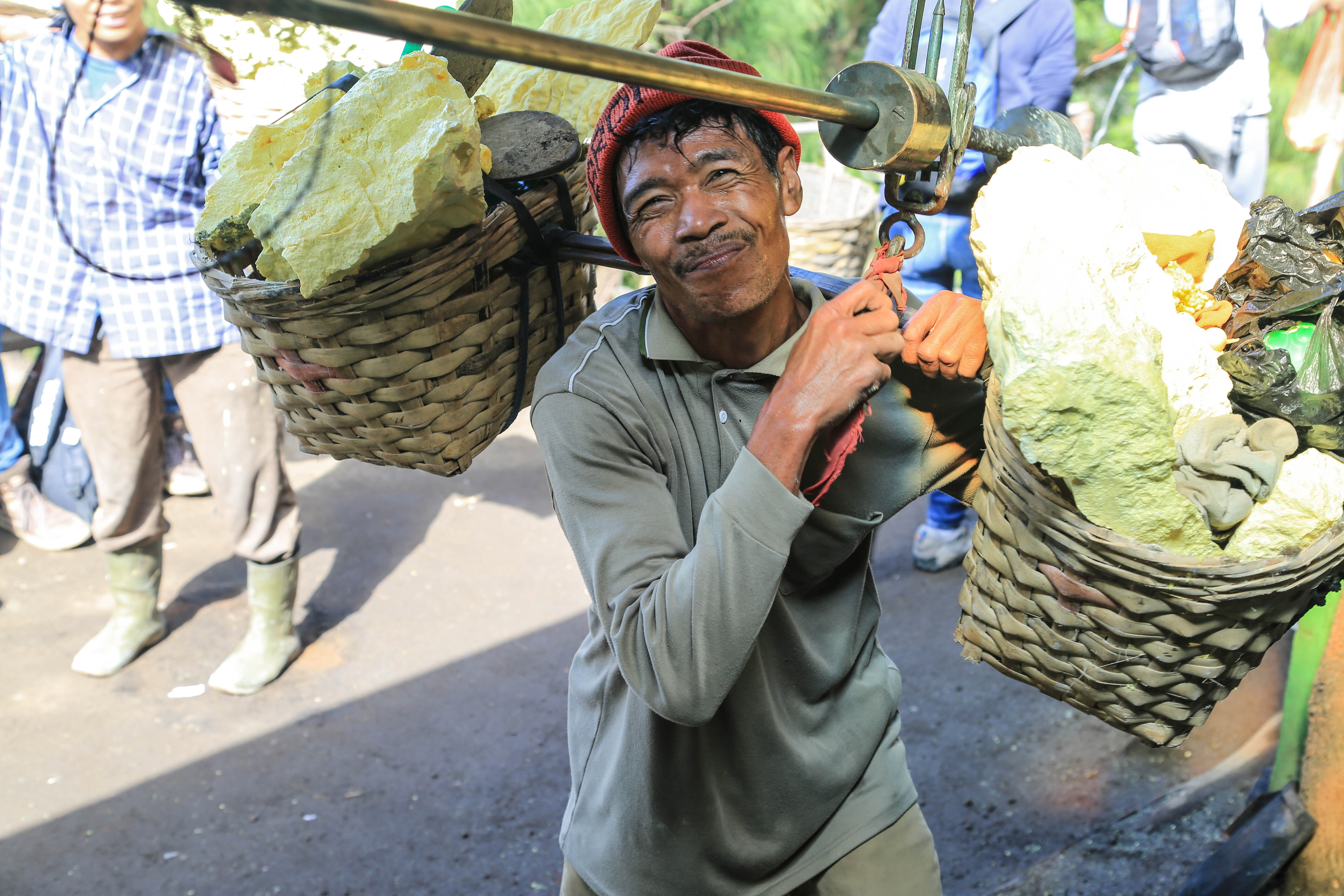 Thế nhưng, để mưu sinh, những con người nhỏ bé ấy vẫn hàng ngày gánh trên vai từ 65 tới 90kg quặng/ chuyến, lầm lũi lên xuống Ijen, như là một phần cuộc sống vốn đã rất quen thuộc của họ. Du khách tới đây, để tỏ lòng thông cảm và giúp đỡ những người thợ mỏ, thường mua những miếng quặng nhỏ, hoặc mời họ cốc cà phê, điếu thuốc. Những con người chất phác và hiền lành ấy, sẽ phá lên cười khi ai đó chào họ bằng tiếng của người Java: “Monggo!”