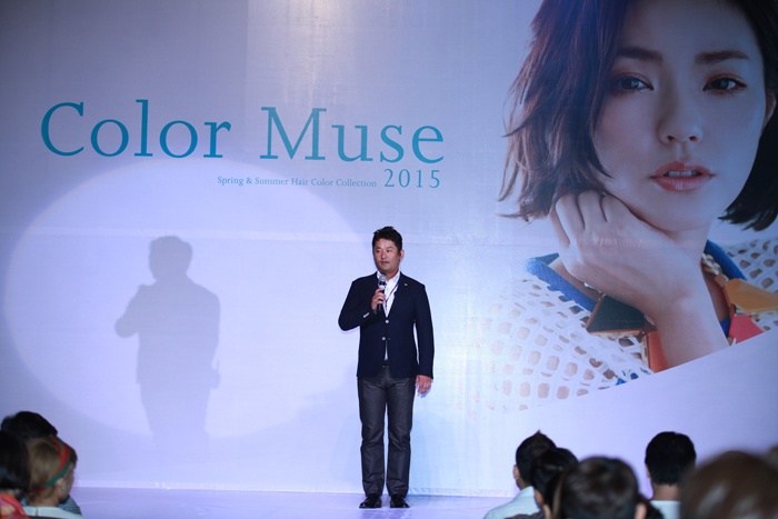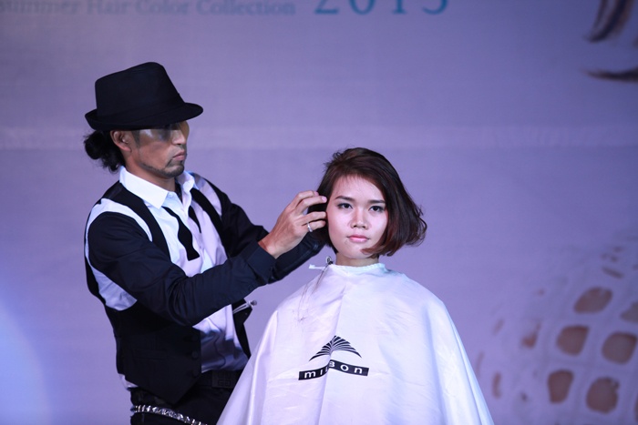 | Các khách mời tham dự hội thảo Color Muse của Milbon còn được tận mắt thưởng thức phần trình diễn kỹ thuật cắt tóc của các chuyên gia đến từ Nhật Bản và Hàn Quốc. Trong ảnh là nhà tạo mẫu Iwata (Vamp Hair Line - Nhật Bản) biểu diễn cắt tóc cho người mẫu ngay trên sân khấu. |