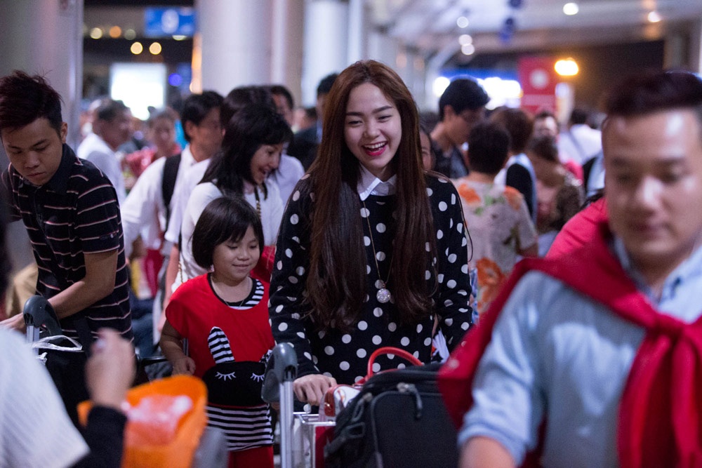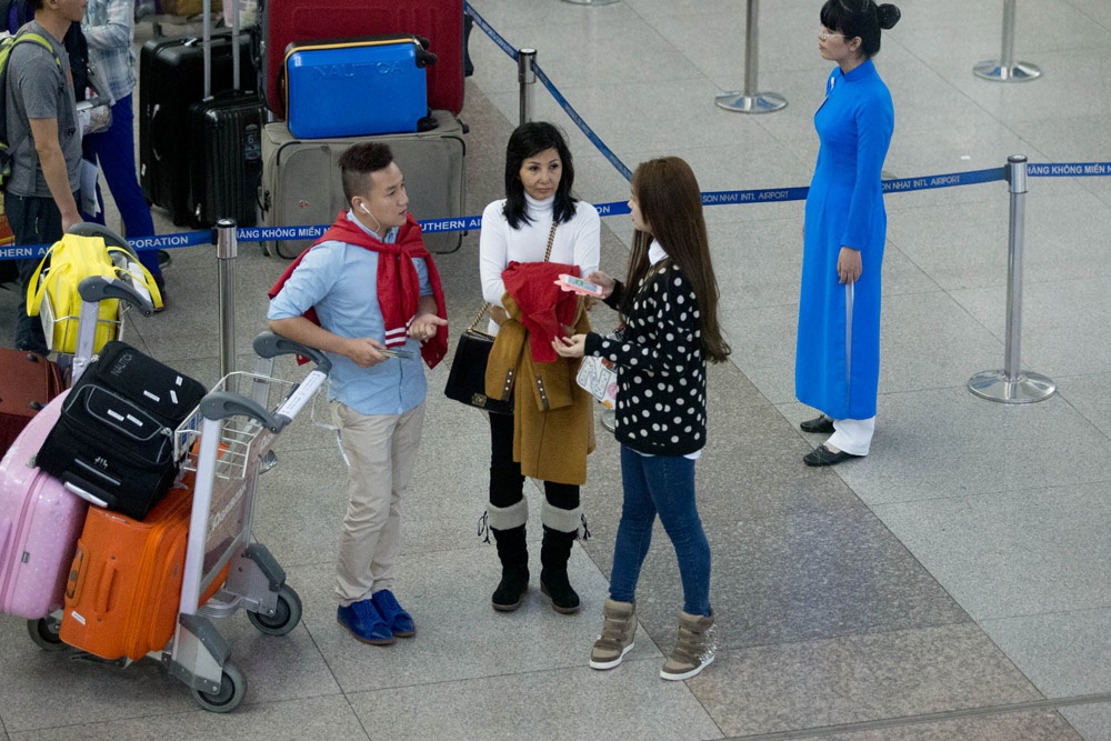 Minh Hằng, mẹ và MC Anh Khoa đang chuẩn bị làm thủ tục tại sân bay Tân Sơn Nhất trong chuyến bay muộn.