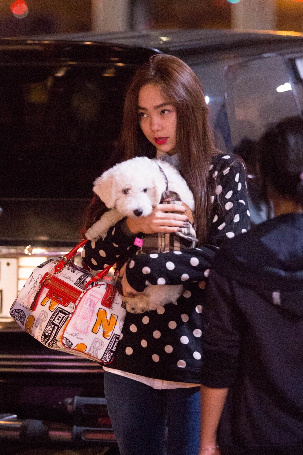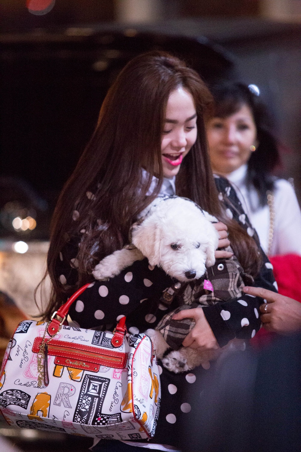 Minh Hằng bế cún cưng ra sân bay lúc nửa đêm