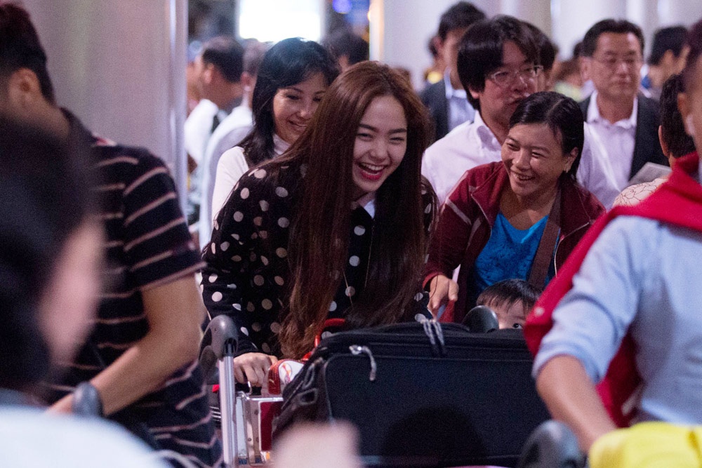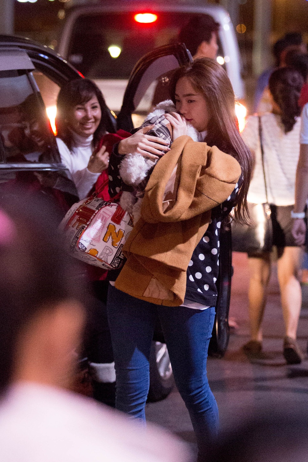 Nữ diễn viên xinh đẹp ăn mặc kín đáo, giản dị. Vì thời tiết Hàn Quốc lạnh nên cô chuẩn bị khá nhiều quần áo ấm.