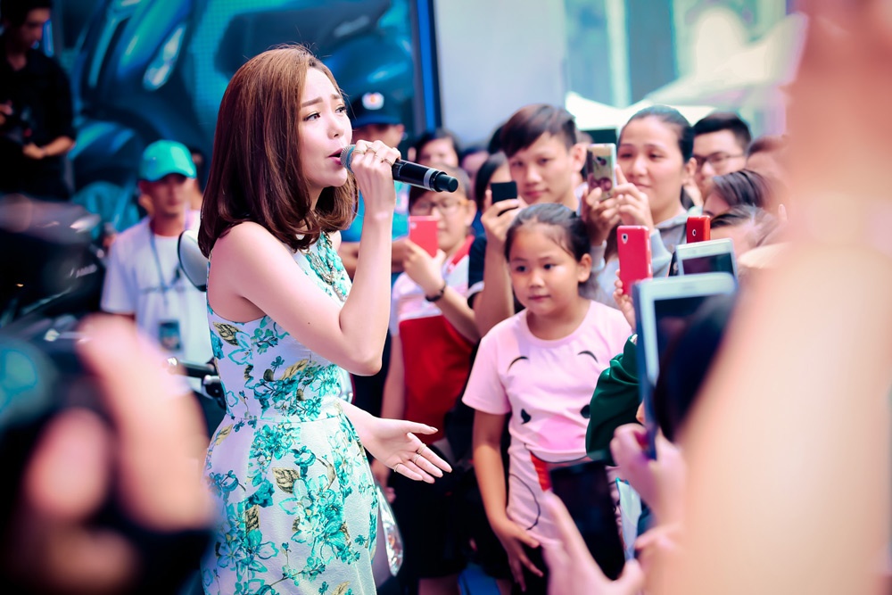 | Xuất hiện trong sự kiện, nữ diễn viên diện váy họa tiết hoa xanh trẻ trung, nữ tính. Rất nhiều fan đã có mặt để gặp gỡ và giao lưu cùng Minh Hằng. Cô cũng khá thoải mái khi được yêu cầu đội mũ bảo hiểm đi xe máy trước sự chứng kiến của fan. |