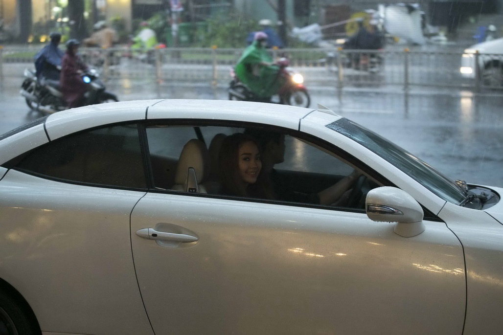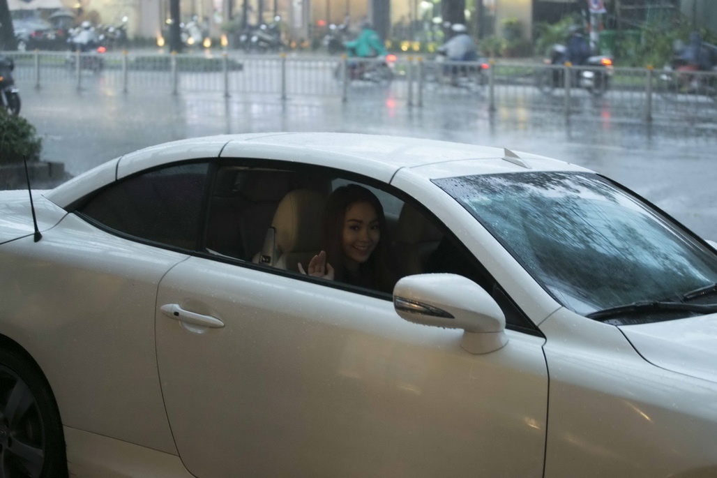 Minh Hằng được em trai lái xe đưa đón ngày mưa