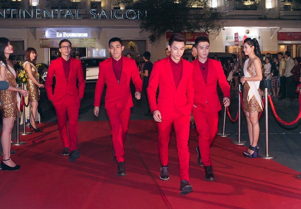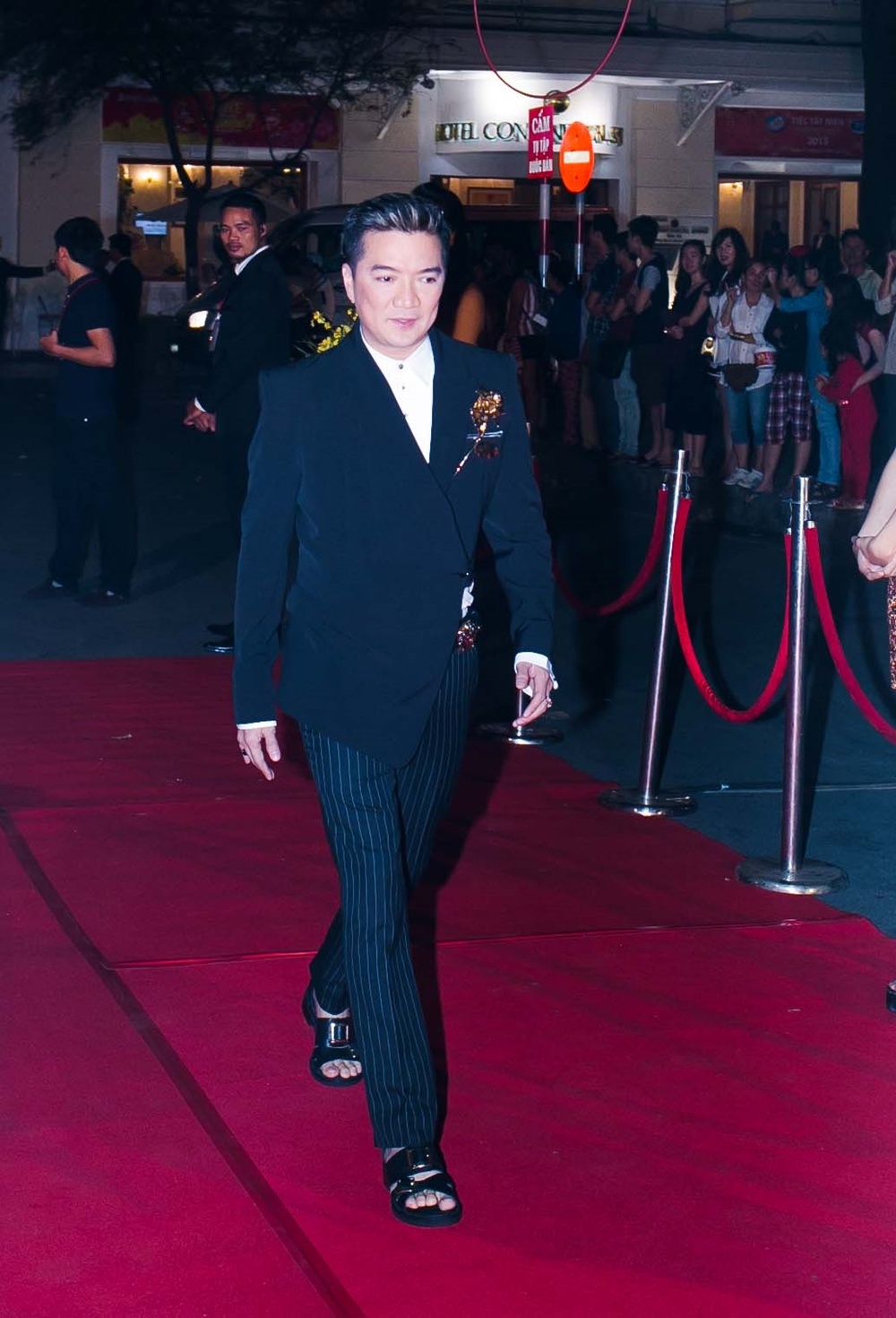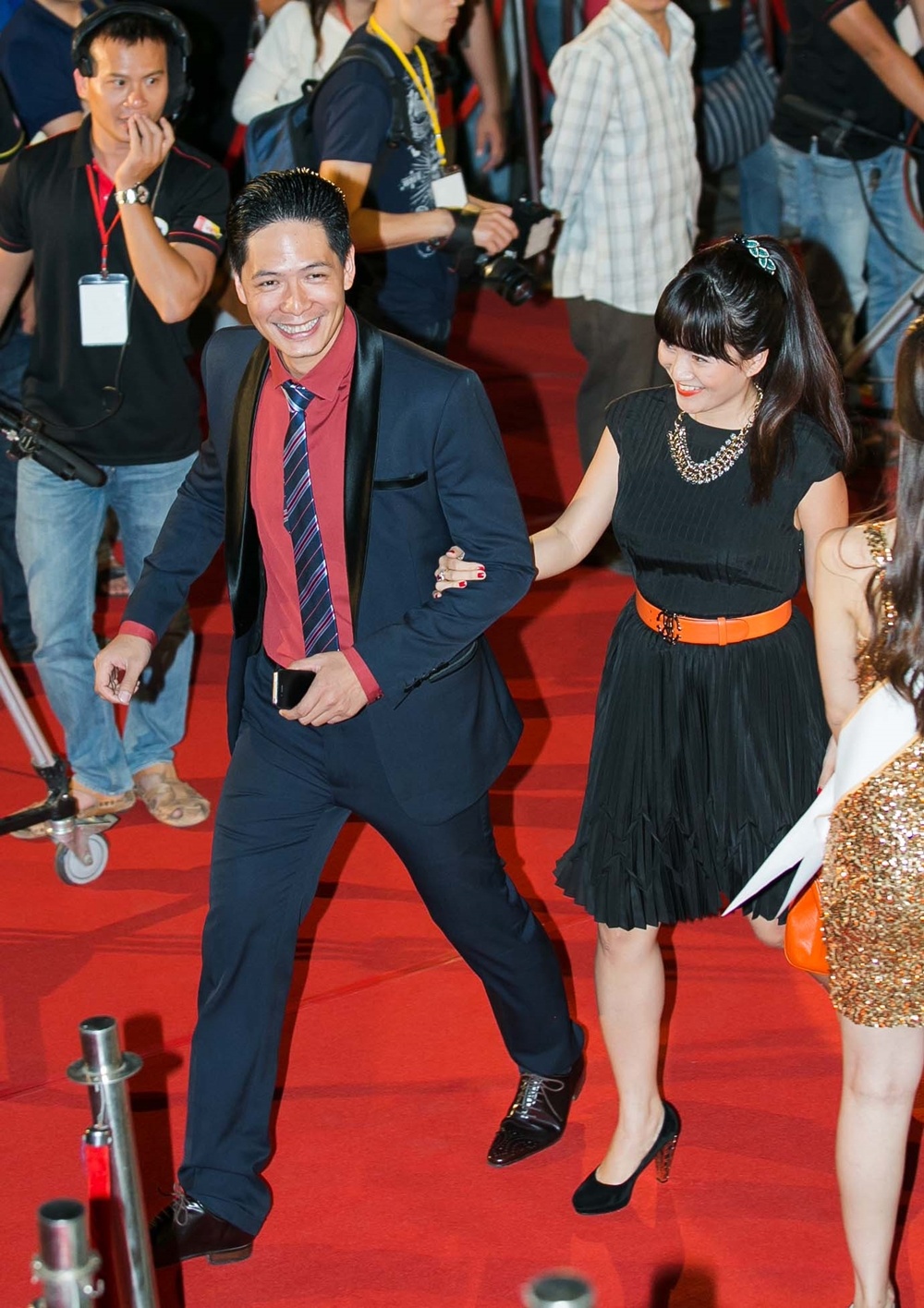 | Nam danh hài Hoài Linh rực rỡ trong tà áo dài vàng. Khi vừa bước chân tiến lại gần thảm đỏ, anh đã nhận được rất nhiều sự cổ vũ của khán giả. |