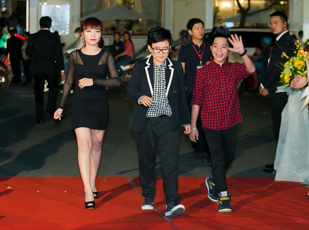 | Phương Uyên không đi cùng Bee.T như thường lệ, mà lần này cô dìu dắt hai đàn em nhỏ hơn là Quang Anh của The Voice Kids và Thảo My của The Voice. |