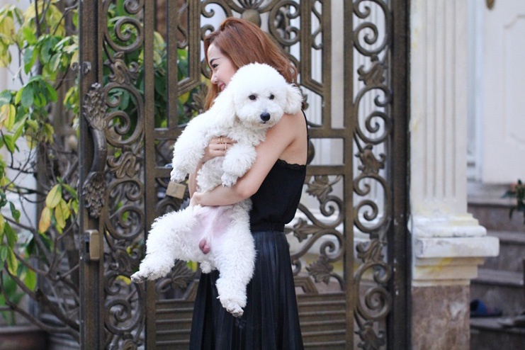 | Nữ diễn viên thích thú khi vừa về đến cổng nhà, chú cún cưng đã chạy ra đón cô. Là người yêu mến con vật, Minh Hằng cũng nhiều lần đưa cún đi diễn hoặc ra sân bay. |