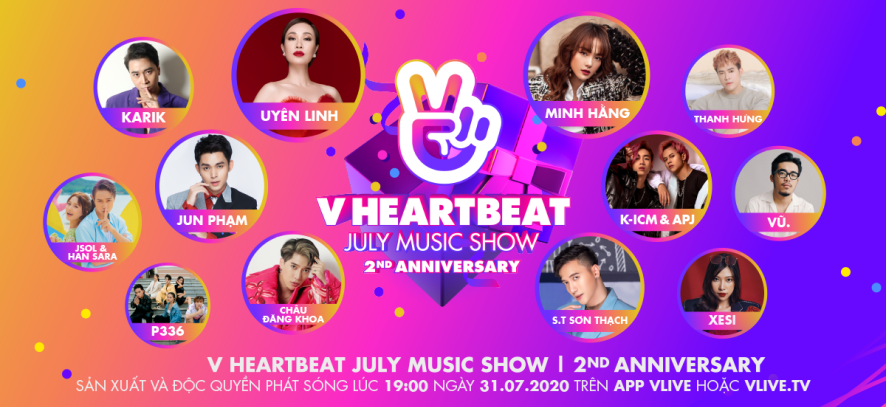 V Heartbeat Music show là chương trình âm nhạc hàng tháng của VLive, được thực hiện dựa trên bảng xếp hạng V Heartbeat Rank. Chương trình V Heartbeat music show tháng 7 đánh dấu 2 năm ra mắt khán giả tại Việt Nam, được phát sóng trực tiếp độc quyền trên VLive TV. Độc giả có thể theo dõi concert tại đây.