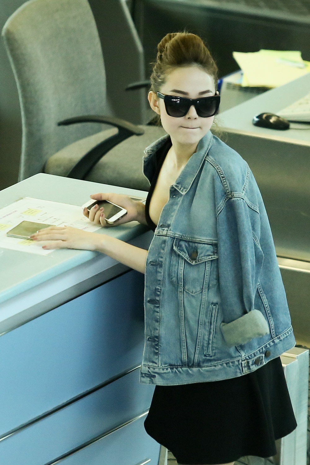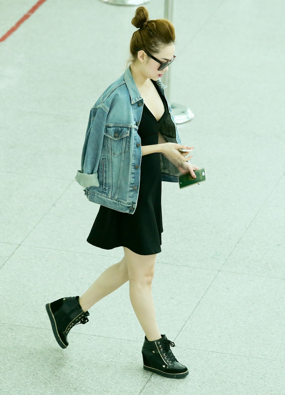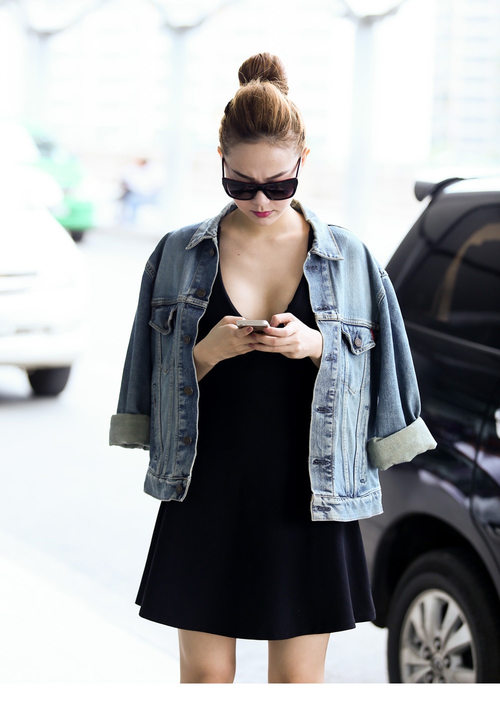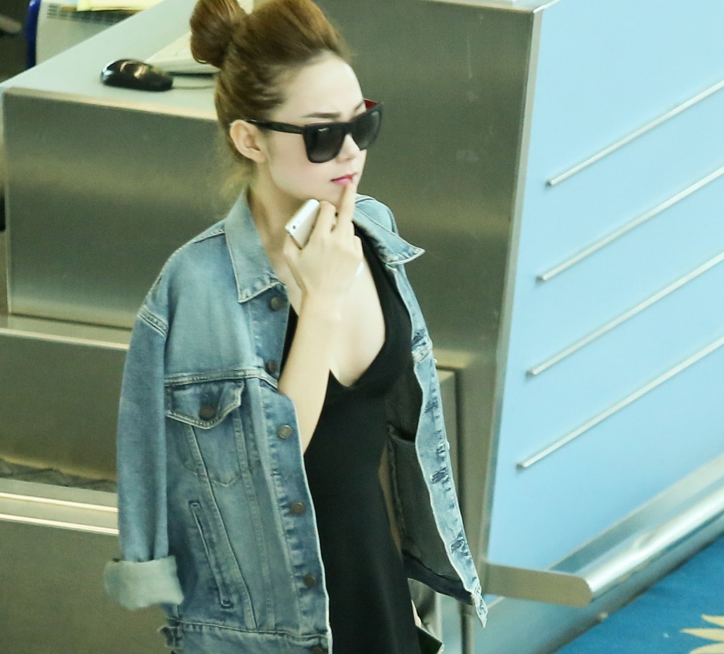| Nữ diễn viên khoác nhẹ áo jeans bên ngoài cho khỏi lạnh. Khi làm thủ tục check in, cô gặp trục trặc về giấy tờ tùy thân. Người đẹp phải đứng ở khu vực check-in khá lâu để giải thích. |
