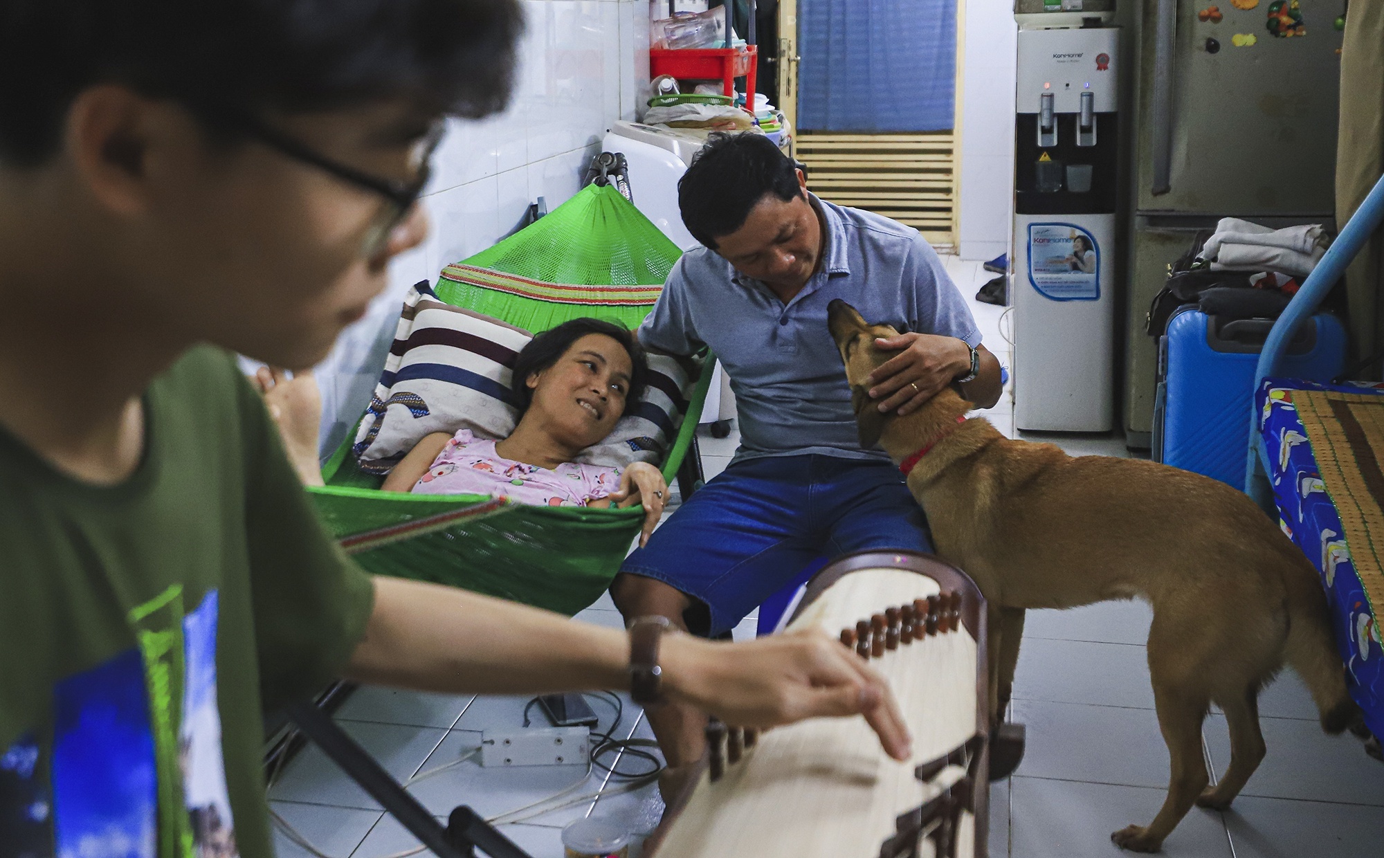 Người đàn ông vội vã ra khỏi nhà để đưa con đi diễn nhưng vẫn nán lại nhìn vào trong nhà khi nghe thấy tiếng chị Đức vọng ra: “Hai bố con đi hết, lại chỉ còn mình mẹ ở nhà với con Bông”. Mỗi lần cả nhà đi vắng, chú chó Bông là người bạn duy nhất giúp chị Đức vơi bớt nỗi cô đơn.