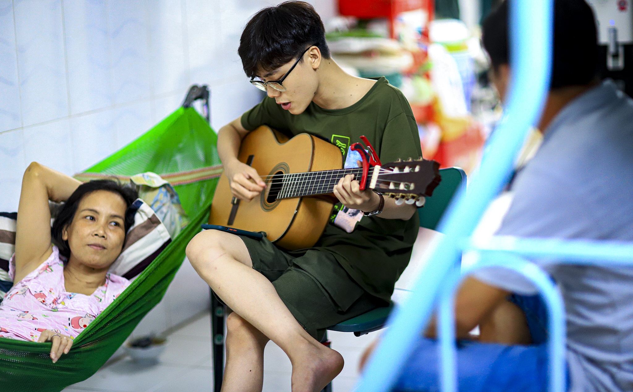 Chờ vợ ở bên ngoài bệnh viện, anh Thành ngồi xem lại những tiết mục của con. Gương mặt người đàn ông tuổi ngoài 40 ánh lên nét rạng ngời mỗi khi xem con biểu diễn. Minh Nhật là niềm tự hào và cũng là động lực giúp anh mạnh mẽ hơn.