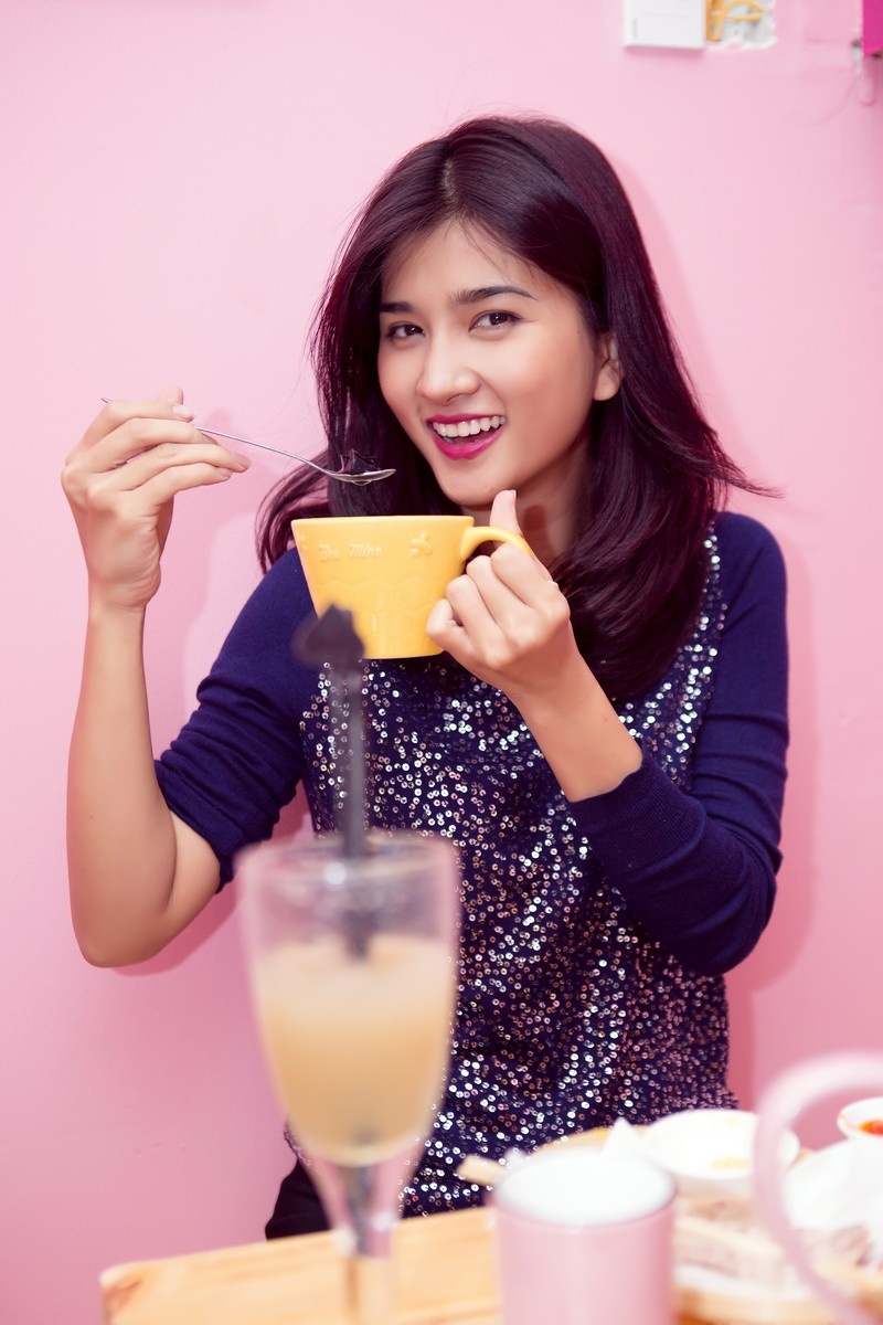 | Minh Triệu thưởng thức sữa tươi trong không gian nhẹ nhàng, lãng mạn của quán. |