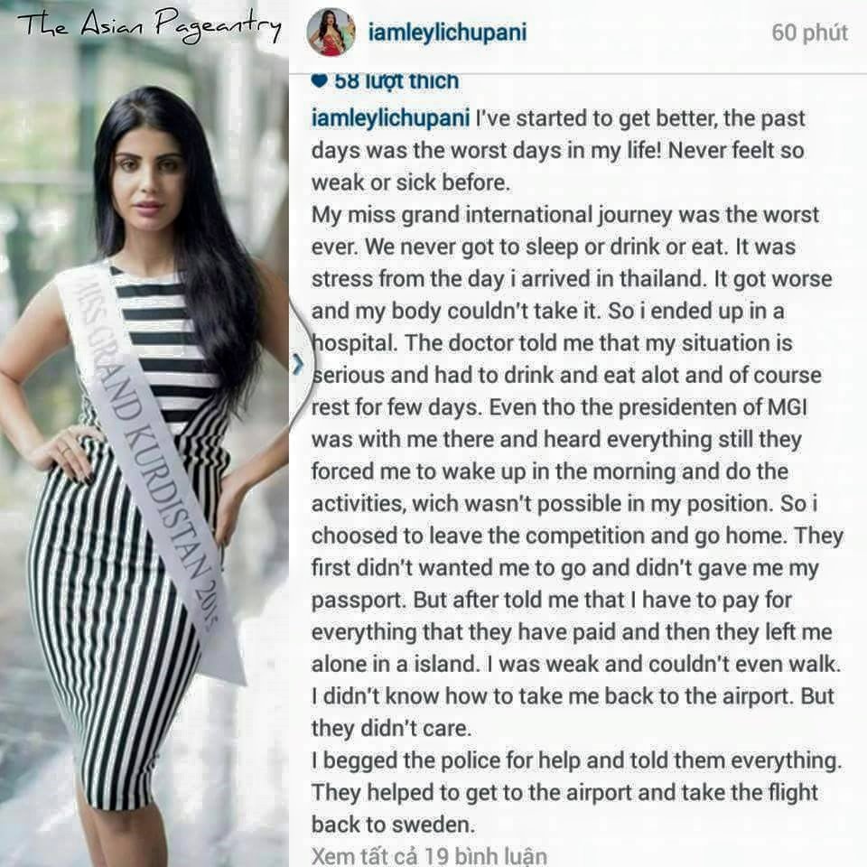 Người đẹp 24 tuổi - Leyli Chupani sau khi trở về từ Bangkok đã cho đăng trên trang cá nhân những bức xúc khi tham dự cuộc thi MGI. Cô cho rằng đó là một trải nghiệm tệ hại nhất trong cuộc đời mình. Leyli tố cáo các thí sinh không được ban tổ chức cho ăn và ngủ đầy đủ, điều đó khiến cô bị suy nhược cơ thể và phải đưa đi bệnh viện. Bác sĩ cho biết cô phải được ăn uống và nghỉ ngơi nhiều hơn để bình phục. Thậm chí, ông chủ tịch của cuộc thi cũng đã đến thăm và biết về tình trạng của cô nhưng lại bắt ép cô phải thức dậy vào buổi sáng để tham gia các hoạt động, dù điều kiện sức khỏe không cho phép.