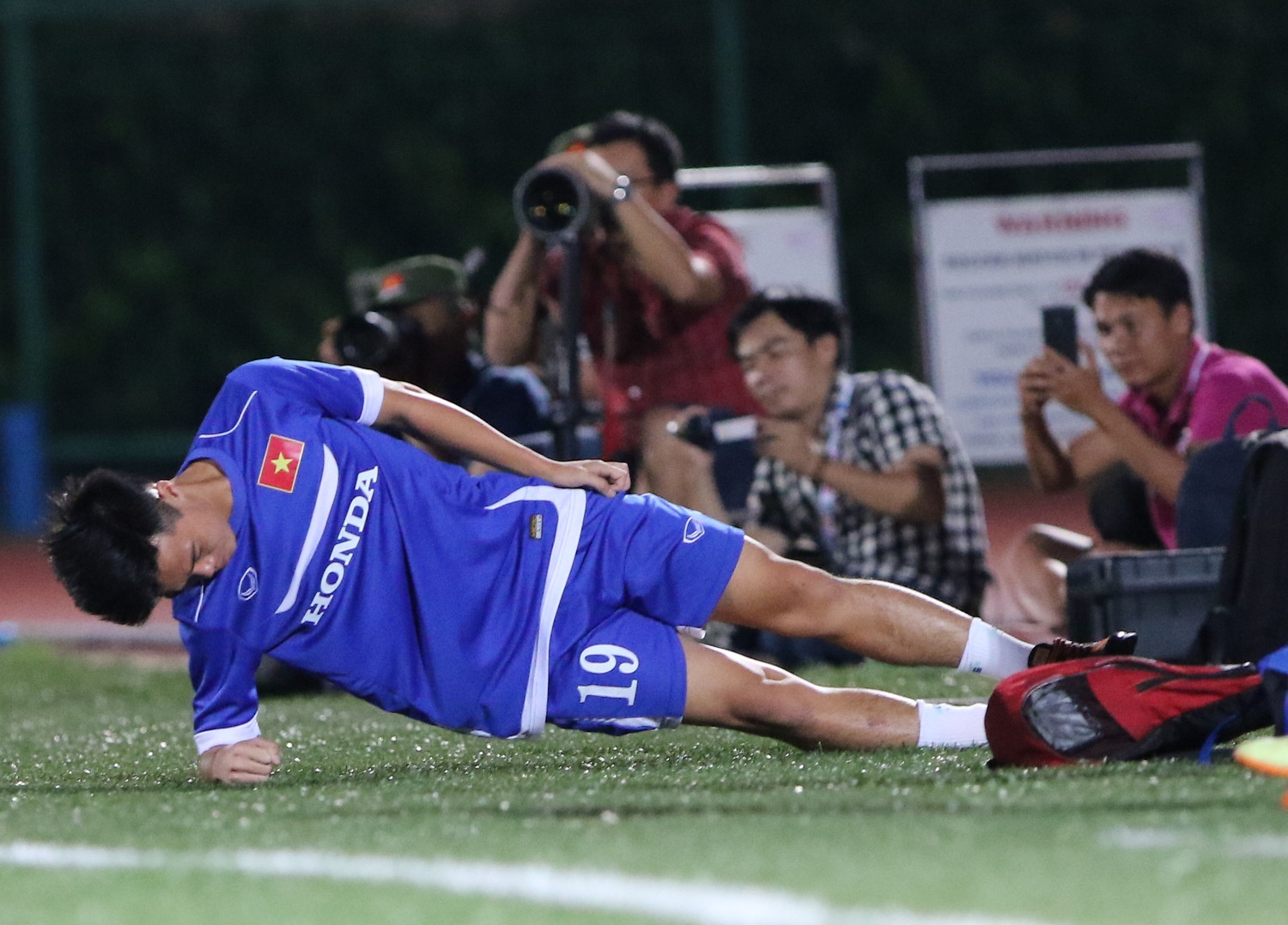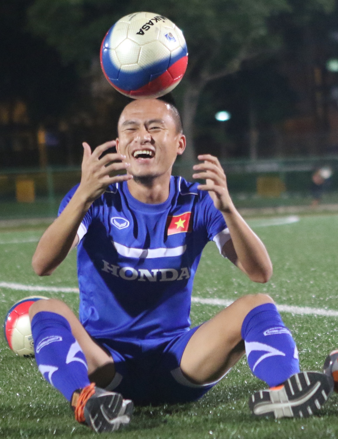 | Kết thúc buổi tập, các cầu thủ U23 Việt Nam thách đố nhau tâng bóng. Huy Toàn và Văn Toàn là 2 cầu thủ giành chiến thắng với hơn 40 lần tâng không để bóng rơi xuống mặt cỏ. |