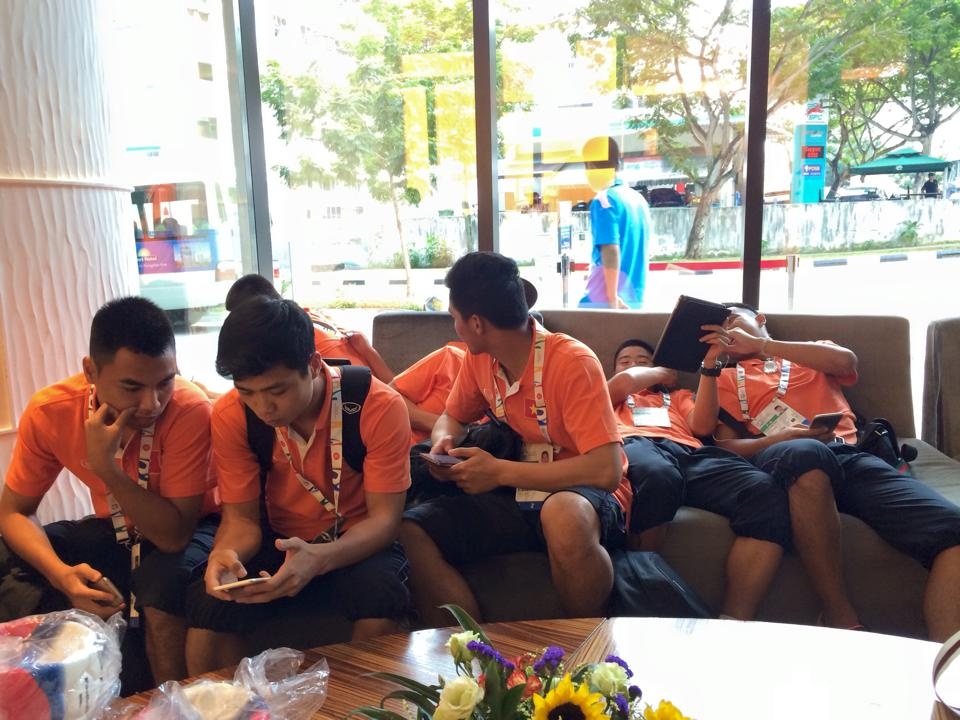 | Trước đó, nhóm cầu thủ U23 từ Việt Nam sang Singapore cũng phải đợi gần 1 giờ đồng hồ mới được BTC SEA Games sắp xếp phòng ở. |