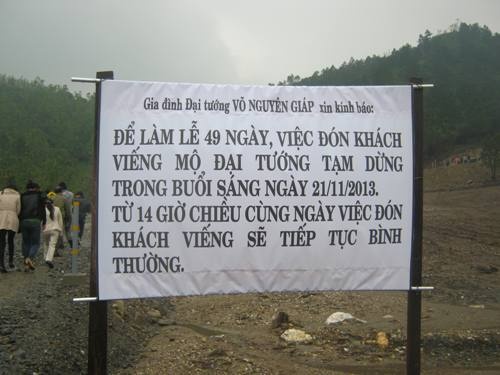 Còn ở Quảng Bình, thông báo từ phía gia đình Đại tướng cho hay, để chuẩn bị cho việc làm lễ “49 ngày”, việc đón khách viếng mộ Đại tướng tạm dừng trong buổi sáng ngày 21/11. Từ 14h cùng ngày, việc tiếp đón các đoàn đến viếng sẽ tiếp tục bình thường.