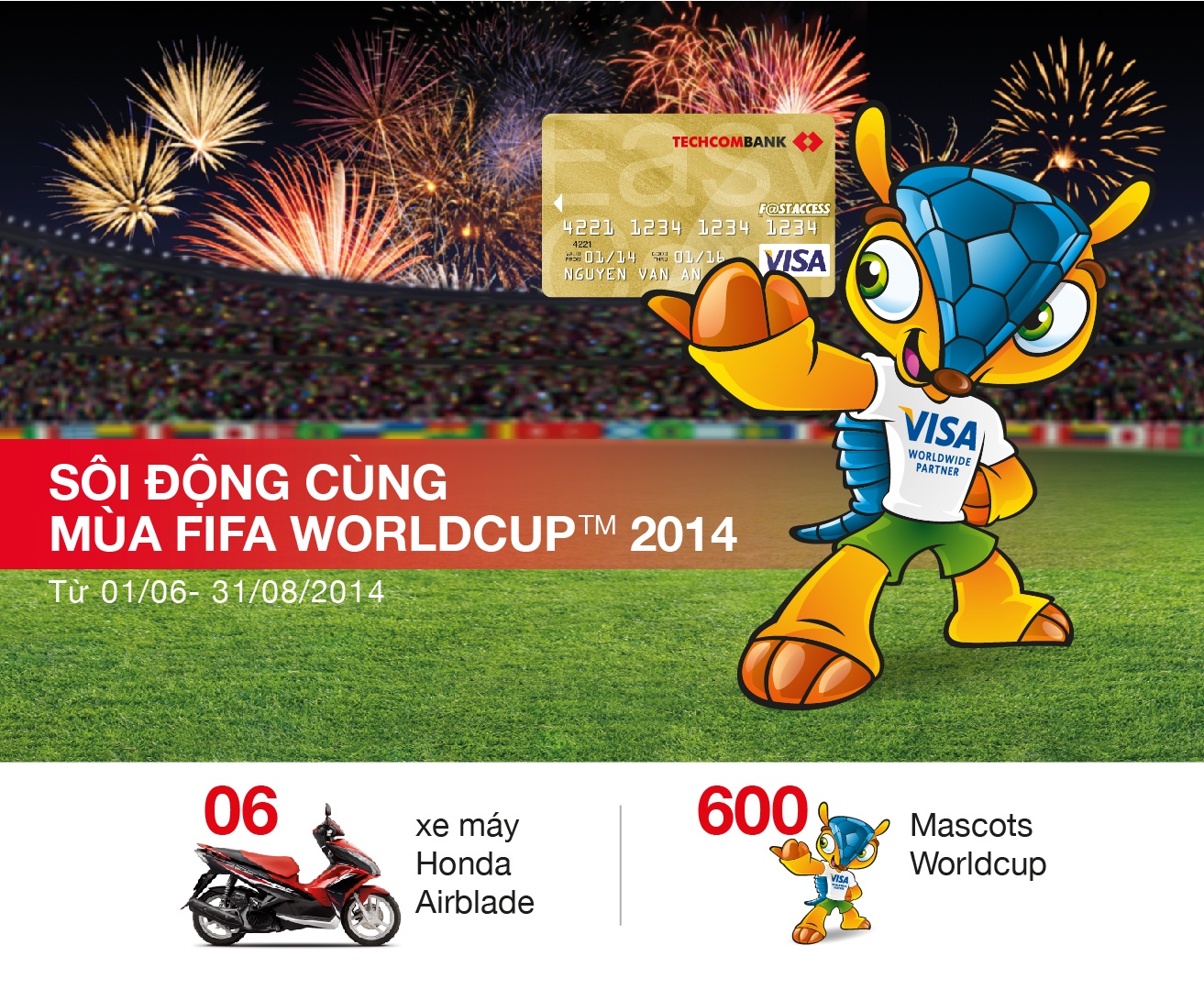 Hòa chung không khí cuồng nhiệt chờ đón trái bóng World Cup 2014 chính thức khai cuộc, ngân hàng Techcombank tổ chức chương trình khuyến mãi Sôi động cùng mùa FIFA World Cup 2014 dành cho tất cả khách hàng đăng ký mở gói tài khoản tại Techcombank trên cả nước. Chương trình có rất nhiều quà tặng giá trị lớn và các kỷ vật từ lễ hội bóng đá lớn nhất hành tinh sẽ diễn ra mùa hè này tại Brasil đang chờ đón các khách hàng.