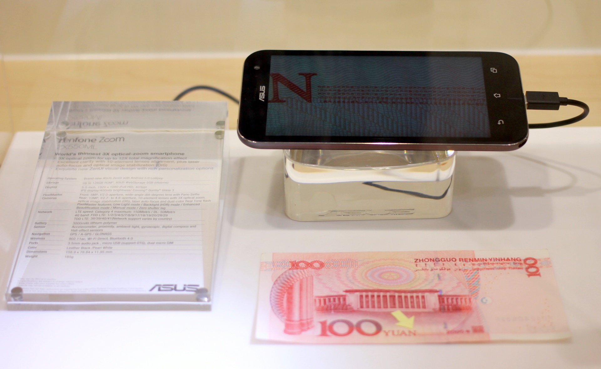 | Hai tháng sau khi được công bố tại CES 2015, Zenfone Zoom vẫn ở dạng thử nghiệm. Trong khi Zenfone 2 đã có thể dùng thử các tính năng, thì model chuyên chụp ảnh của Asus chỉ được trưng bày và chưa cho dùng thử. Hãng này giới thiệu mẫu mô hình tại MWC 2015. Họ đặt tờ tiền giấy bên cạnh và khoe ảnh chụp từ các chi tiết nhỏ nhất. |