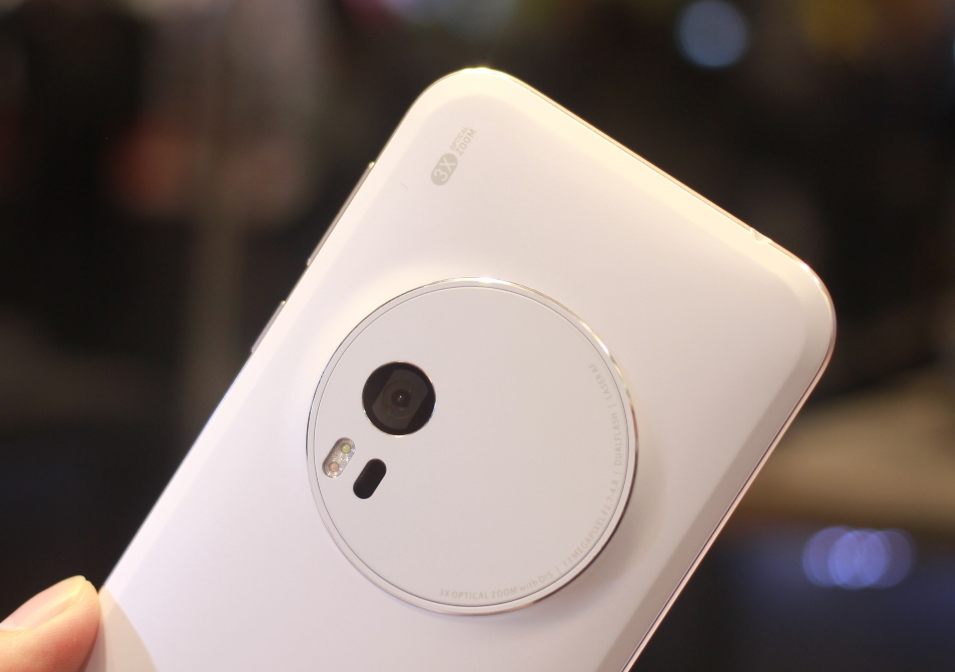 | Zenfone Zoom có máy ảnh 13 megapixel. Mặt sau của thiết bị làm nhiều người hình dung đến Nokia Lumia 1020. Camera của máy có khả năng zoom quang học 3X, lấy nét bằng laser như LG G3. |