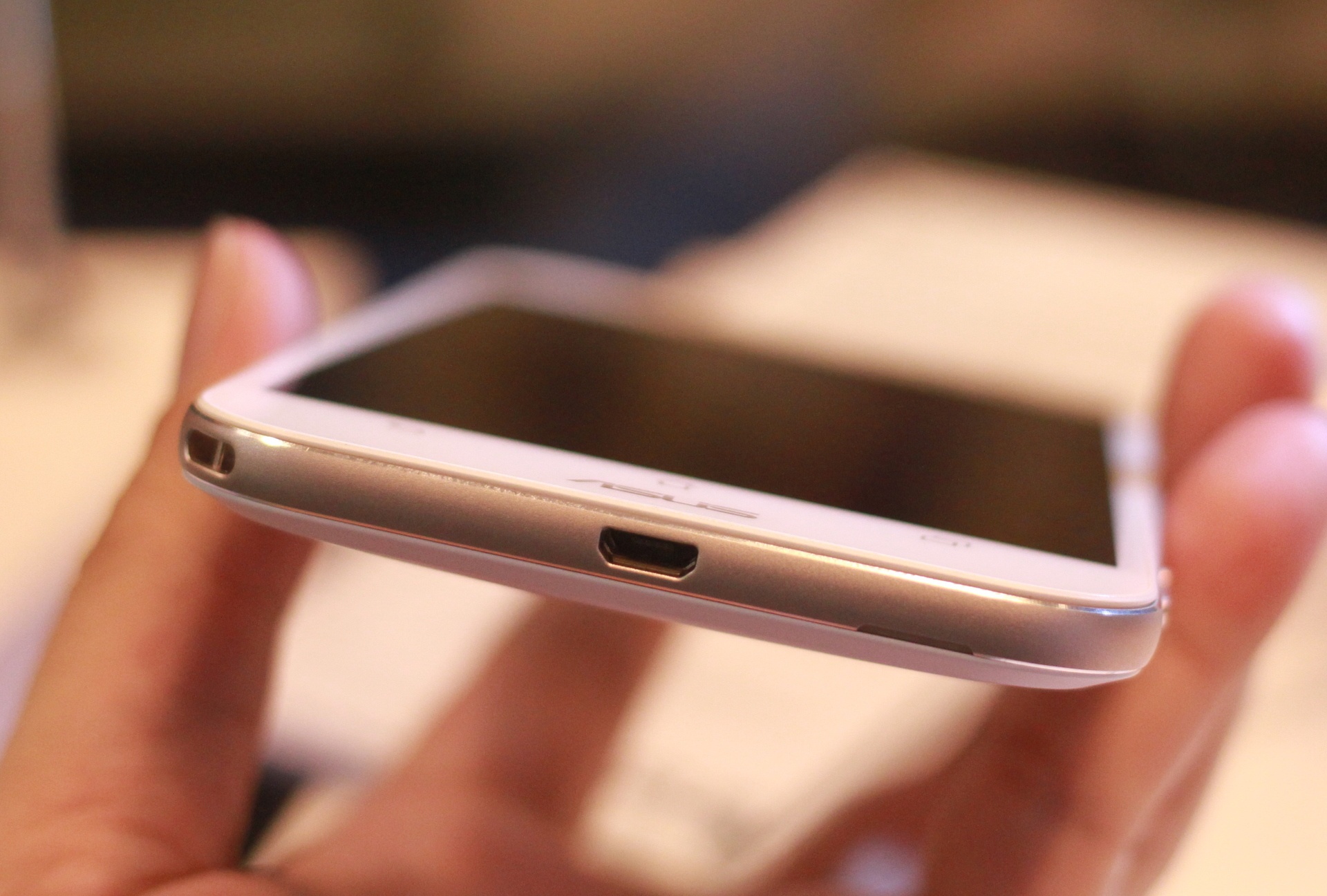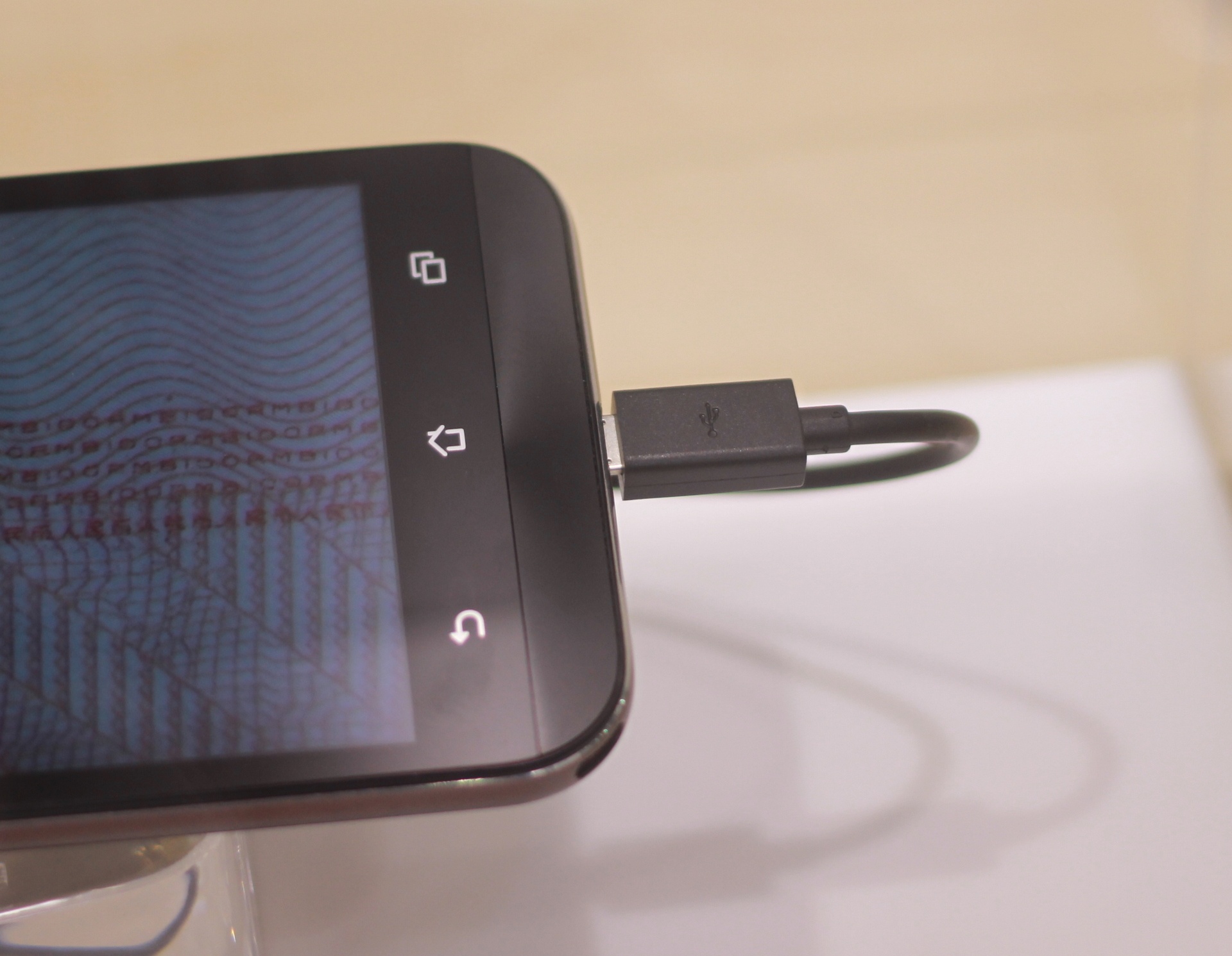 | Nhìn từ bên dưới máy với cổng giao tiếp microUSB, ở góc là lỗ buộc dây đeo. |