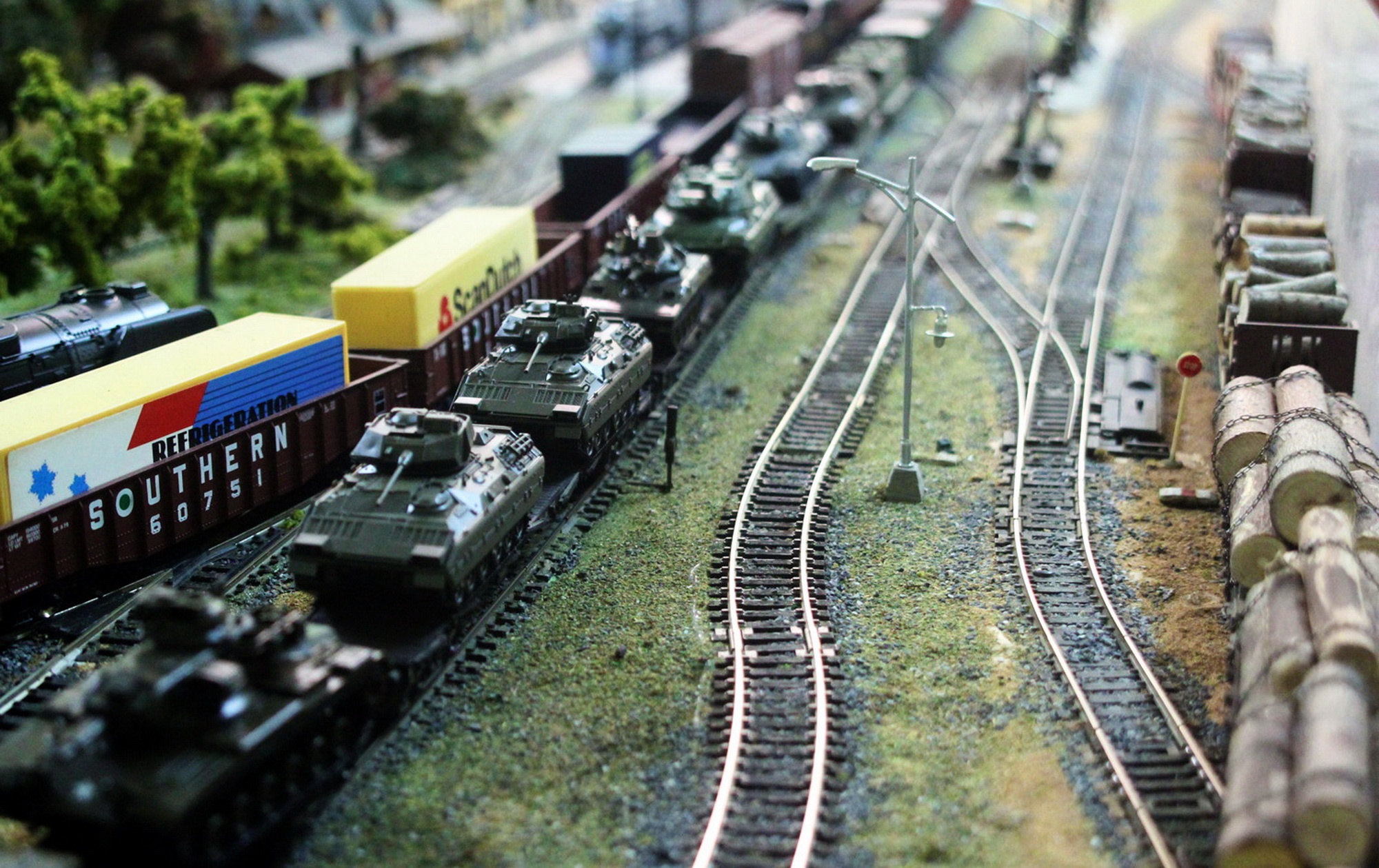 | Các toa tàu chở nhiều hàng hóa khác nhau như gỗ, container, than... trông rất sinh động. |