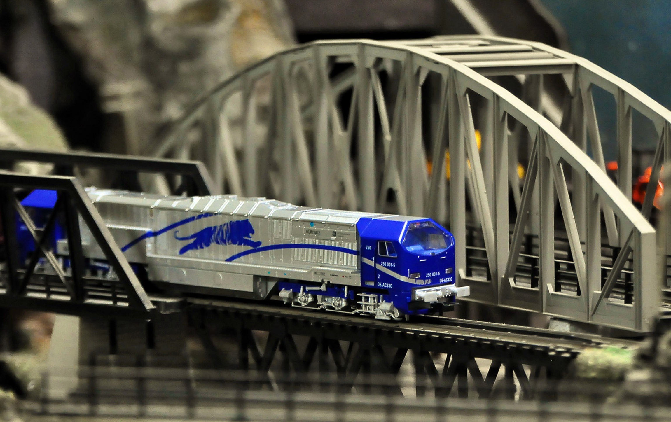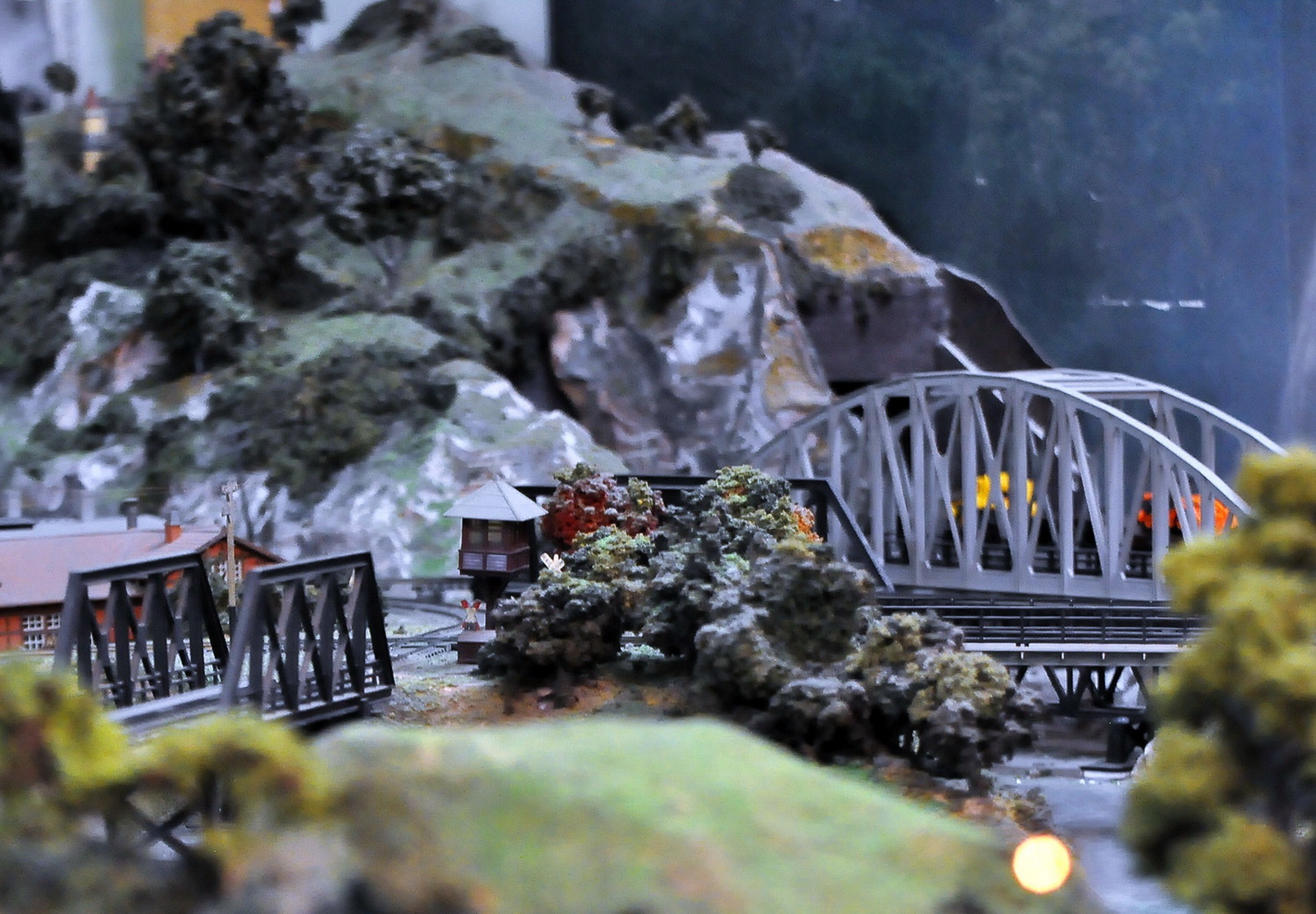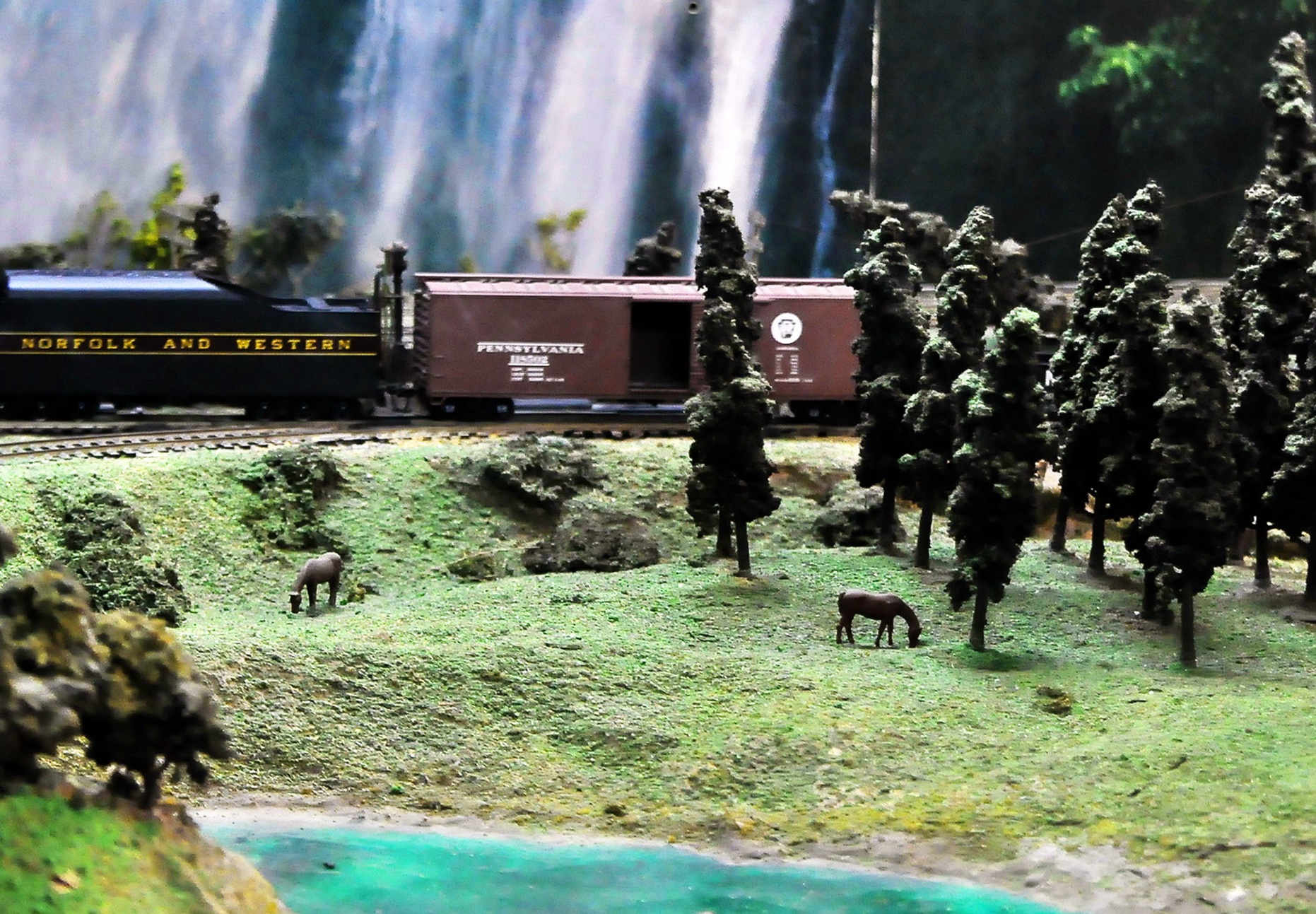 Đoàn tàu mô hình chở hàng và hành khách của một nghệ sĩ guitar có thể nhả khói chạy trên đường ray đi qua nhiều khu vực có phong cảnh đẹp như thật như đồng cỏ, thác nước, hầm, cầu.