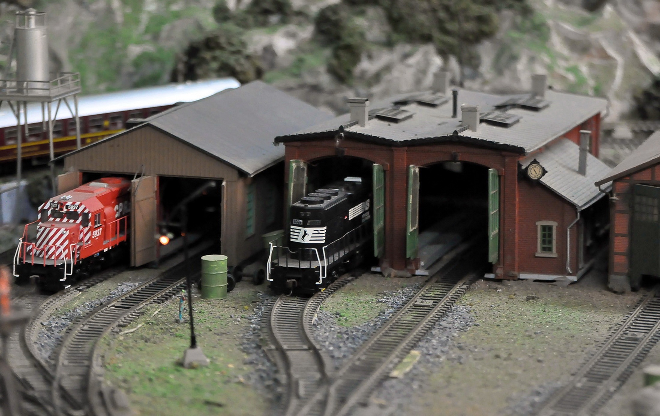 | Trong sa bàn có 3 nhà kho với 6 gian chứa đầu tàu, vừa để chứa vừa dùng để sửa chữa. Ông có thể điều khiển các đầu máy này ra vào kho. |