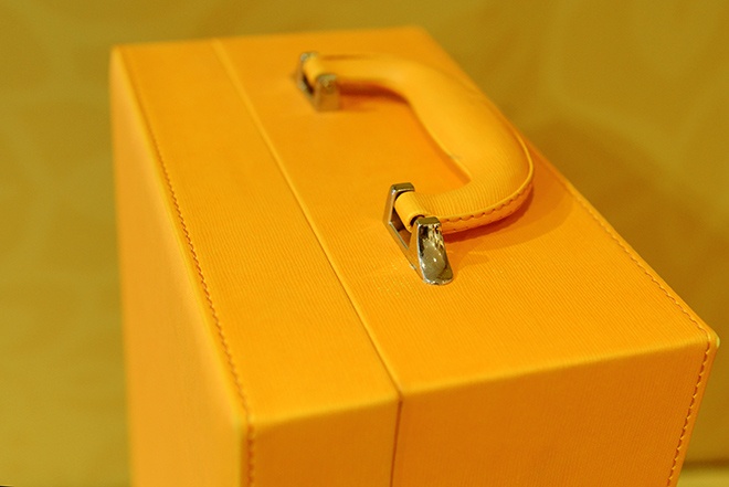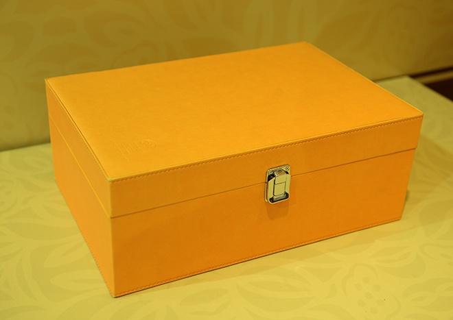 | Sản phẩm được đựng trong hộp da cao cấp màu vàng đặc trưng cho Tết Trung Thu, phía trên có quai xách sang trọng. |