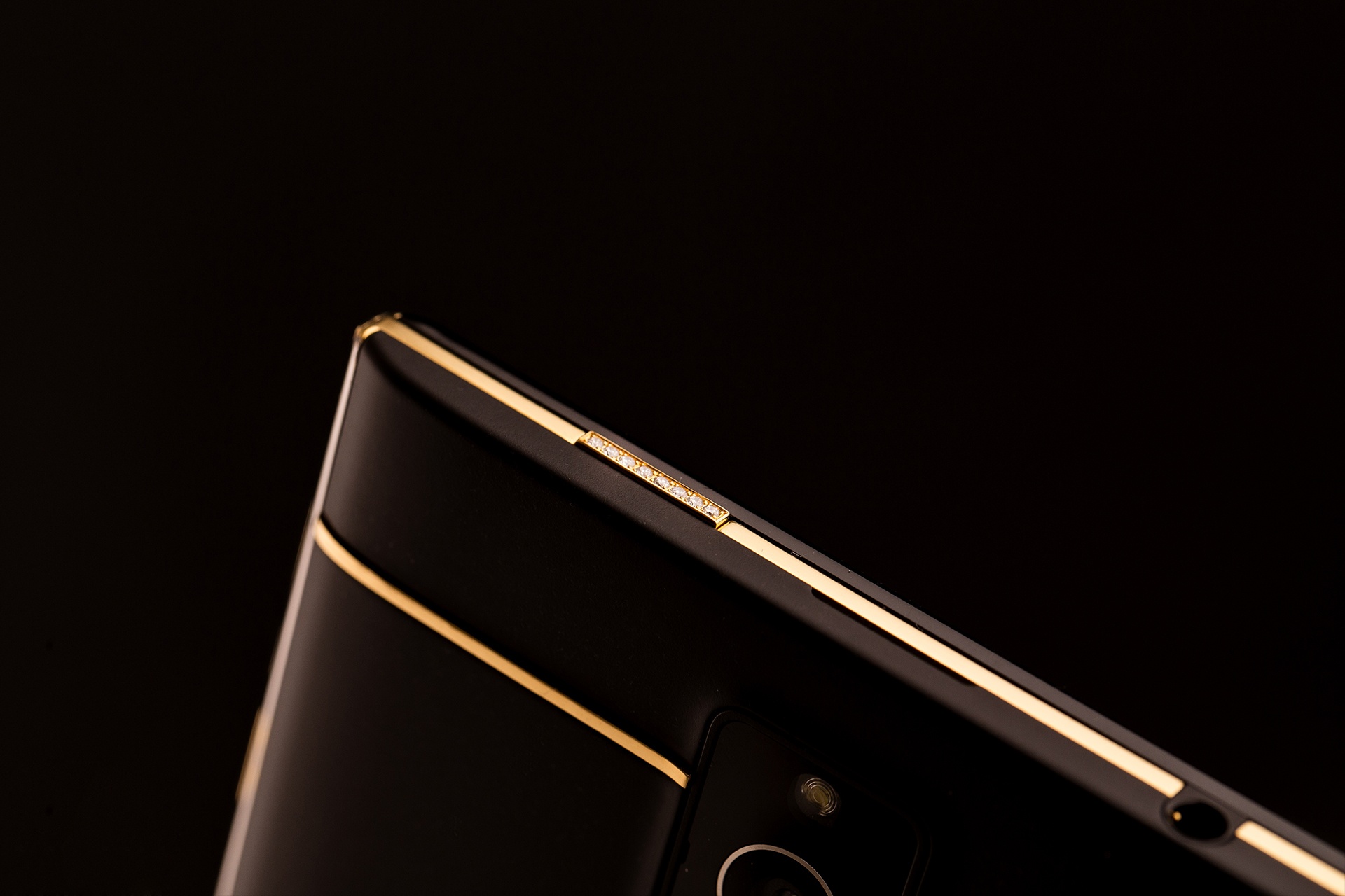 | Phím nguồn đính kim cương. Các đường chỉ đều bằng vàng. |