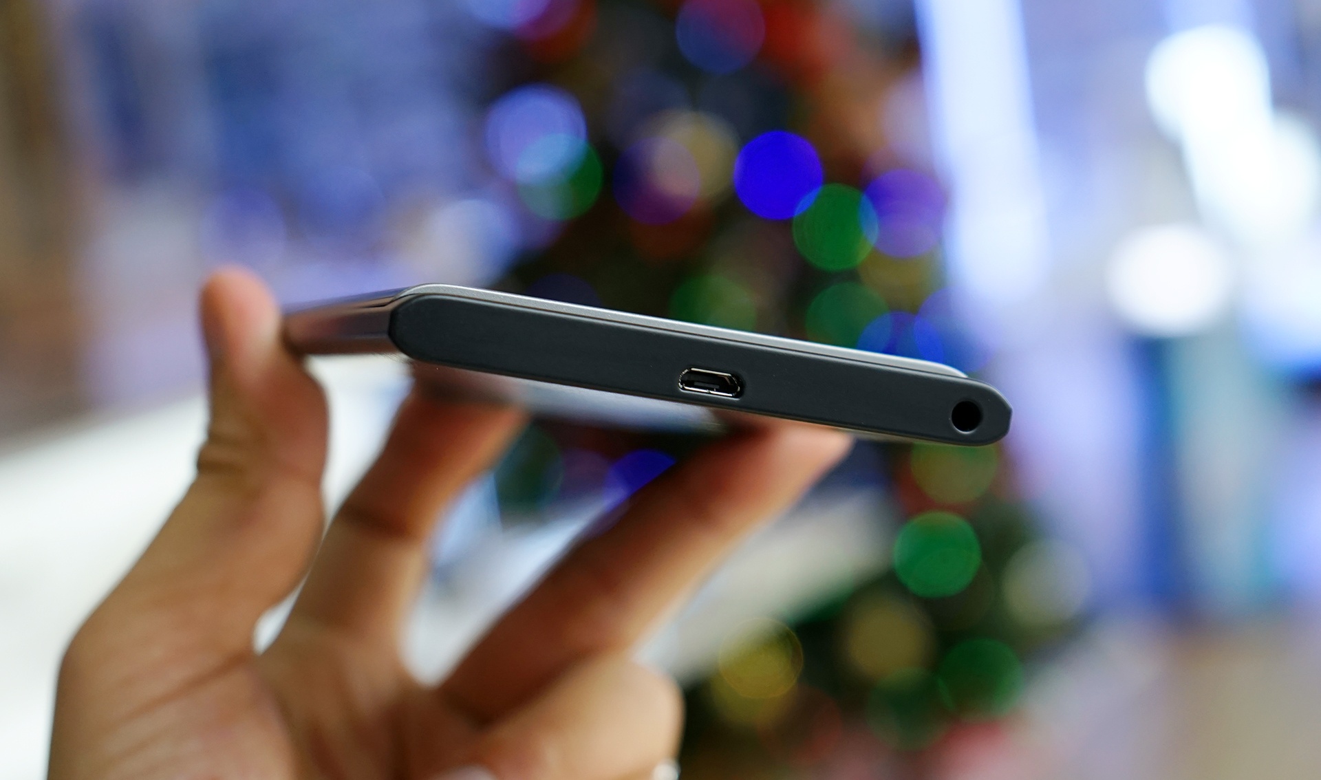 | Cổng microUSB và giắc âm thanh ở cạnh dưới. |
