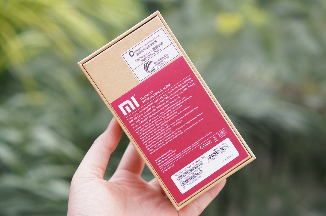 Hộp đựng máy được thiết kế khá đơn giản với vỏ hộp dùng vật liệu tái chế. Phụ kiện đi kèm theo hộp chỉ có cáp kết nối micro USB, không sạc, không tai nghe. Nhà phân phối sản phẩm này tại Việt Nam là Digiworld. Theo đại diện của Hoàng Hà Mobile, những chiếc Redmi 1S về khá bất ngờ. Cửa hàng thậm chí chưa kịp niêm yết sản phẩm trên website. Cũng theo cửa hàng này, sản phẩm thứ 2 của Xiaomi cũng sẽ sớm lên kệ tại Việt Nam trong khoảng 1,2 tuần nữa, có thể sẽ là chiếc Mi4 đình đám.