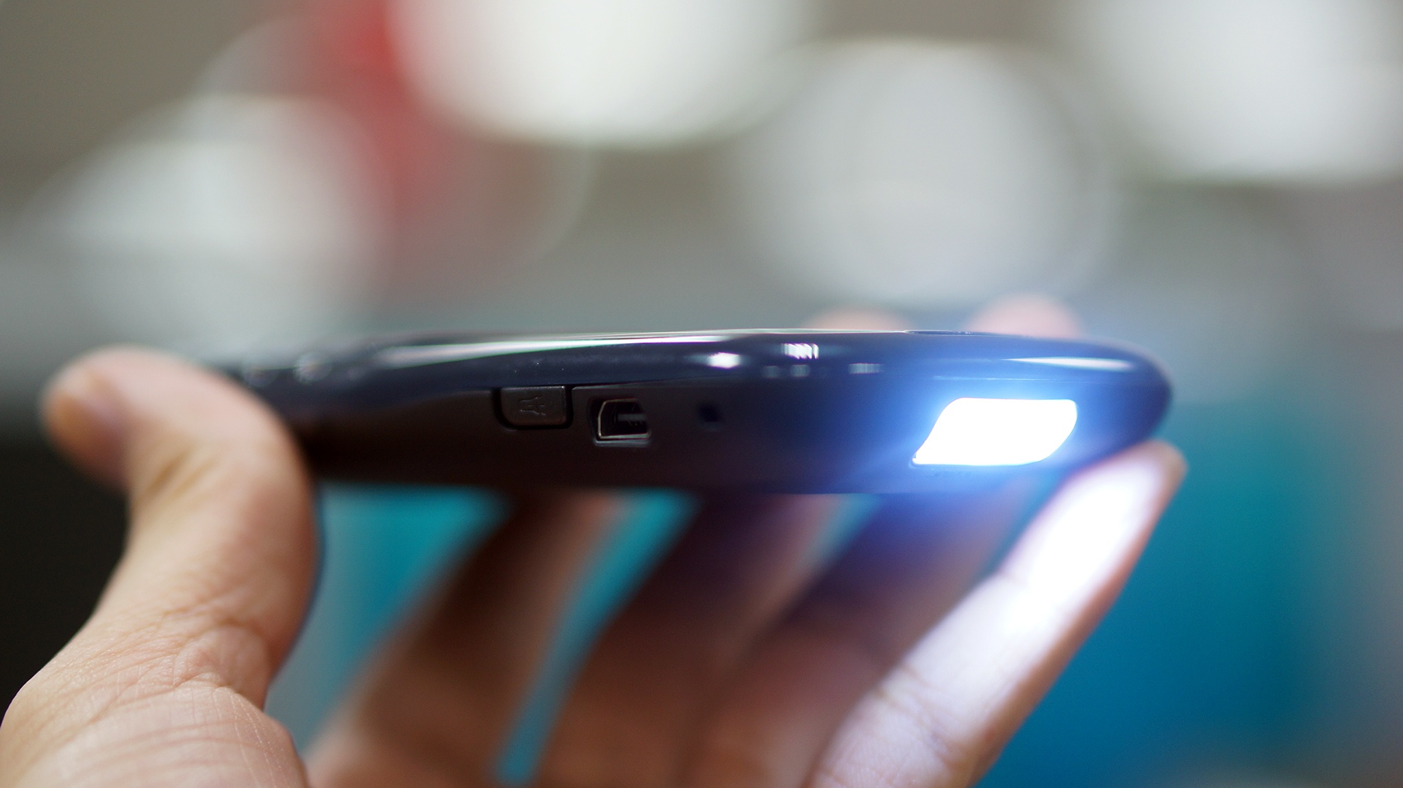 | Giắc cắm sạc MicroUSB, chốt bật đèn pin và chốt khóa máy. |