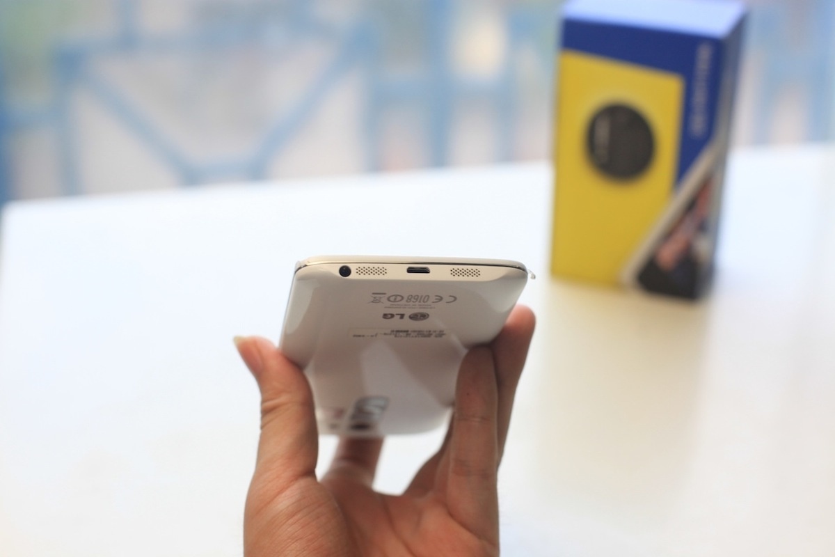 Có một đường viền kim loại chạy dọc thân máy, cho cảm giác không liền khối giữa 2 mặt trước và sau. Đường viền này đã xuất hiện từ thời chiếc Optimus G Pro.