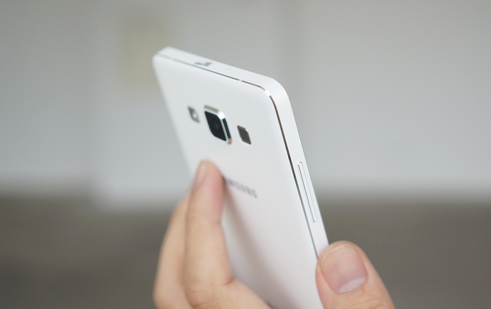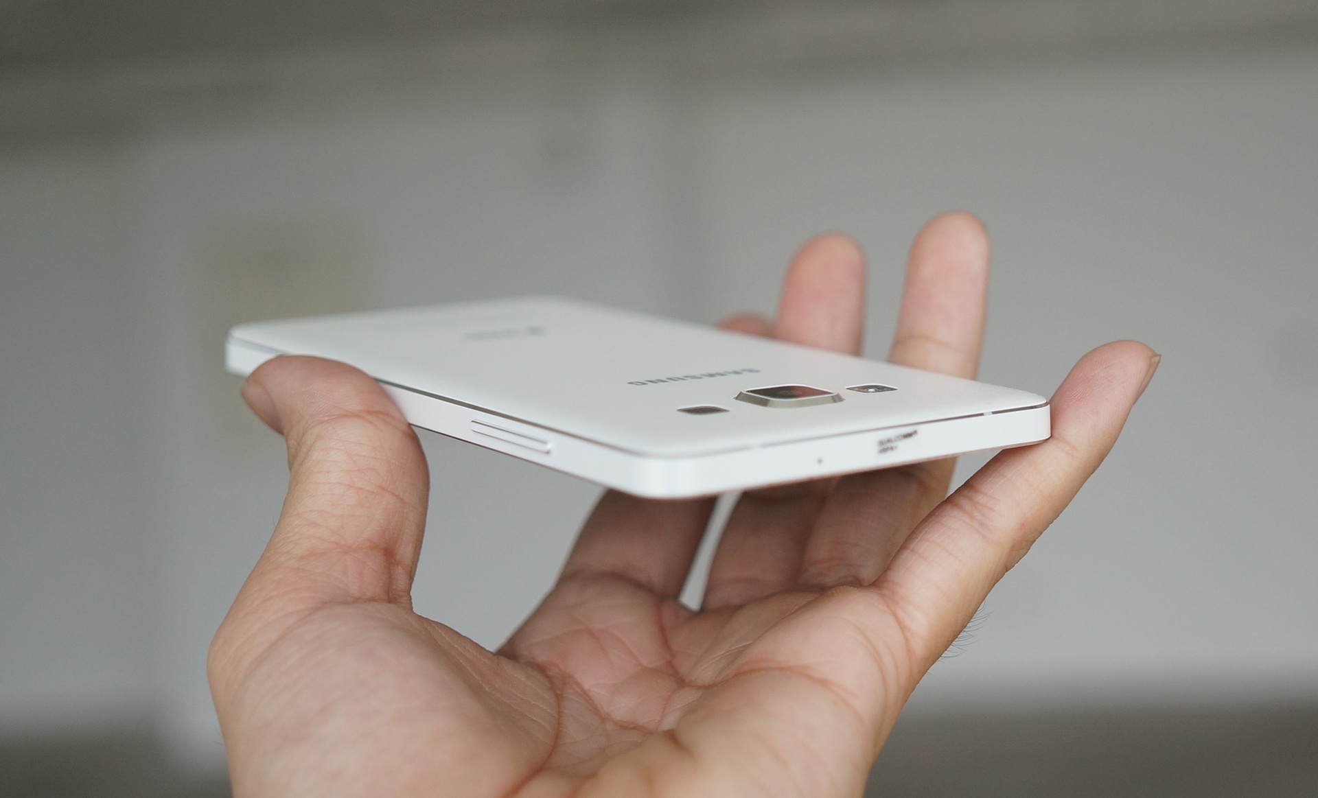 | Galaxy A5 có thân kim loại nguyên khối, các cạnh có các đường cắt ánh kim như trên Galaxy Note 4. |
