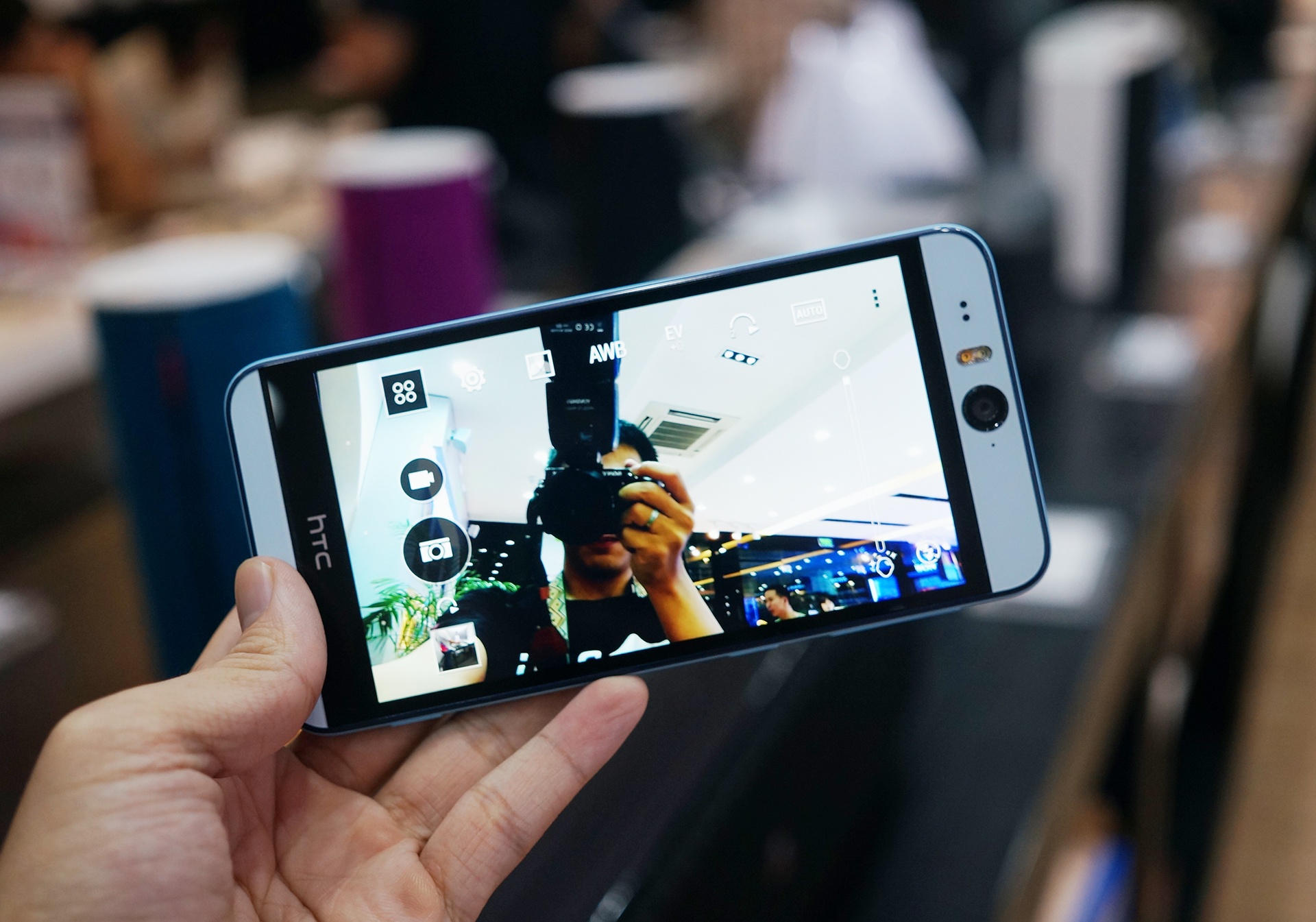 | Desire Eye cũng sở hữu nhiều tính năng chụp và chỉnh sửa ảnh tự động như Split Camera (chụp đồng thời mặt trước và sau), Crop Me In (ghép mặt giữa nhiều chủ thể)... Camera trước có góc khá rộng, giúp người dùng có thể chụp selfie cùng nhóm bạn nhiều người. |