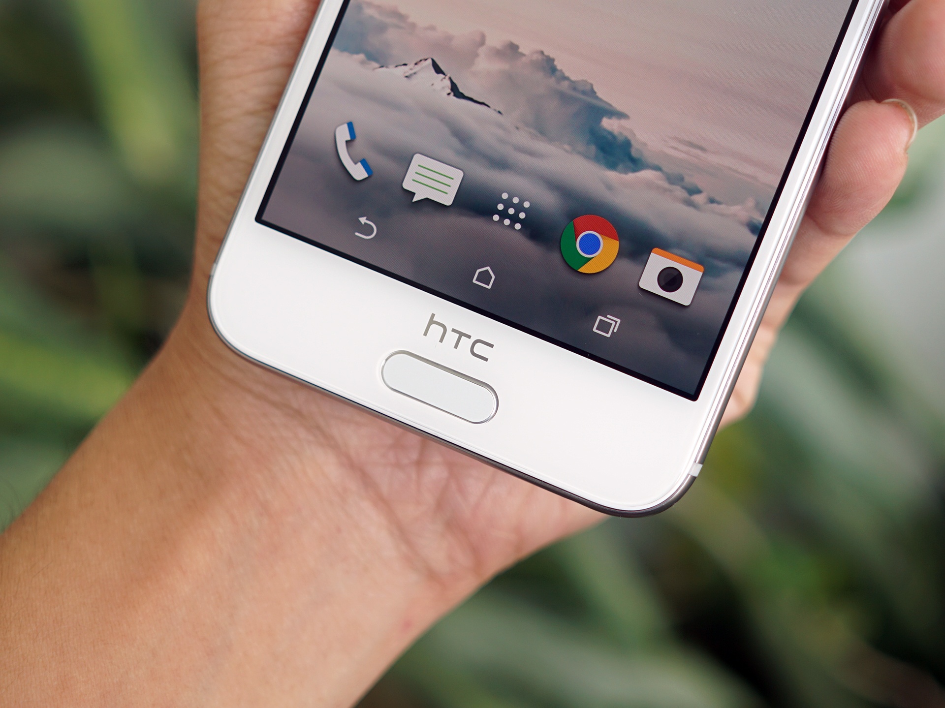 | HTC trang bị một máy quét vân tay có hình dạng giống nút home ở mặt trước. Hãng vẫn mang ba phím cảm ứng vào bên trong màn hình. |