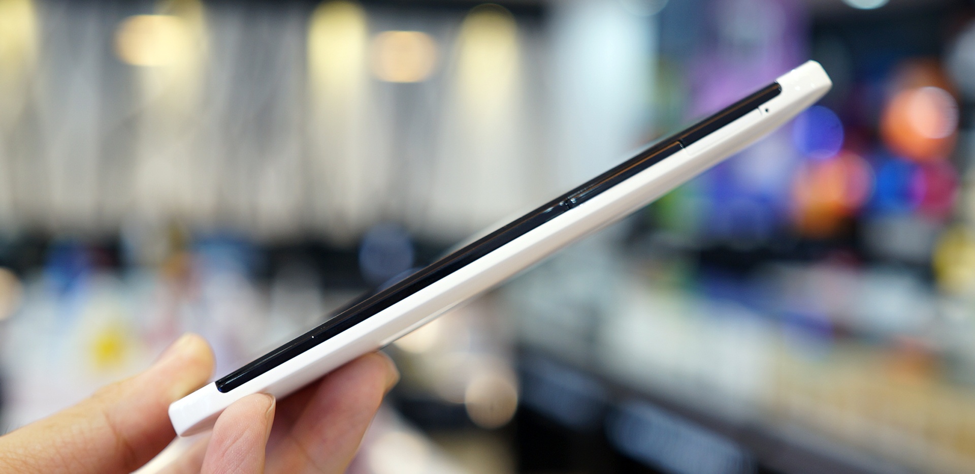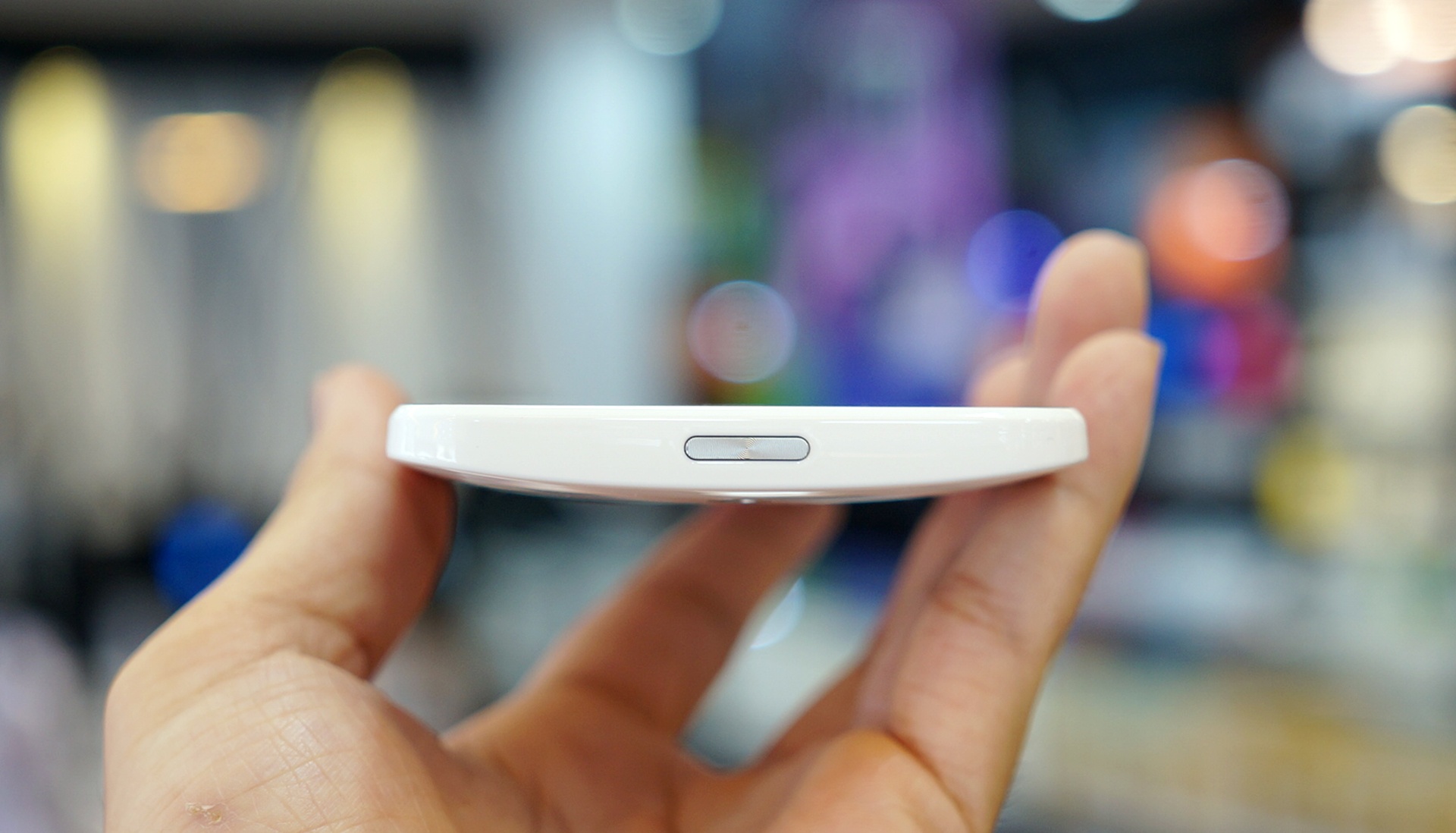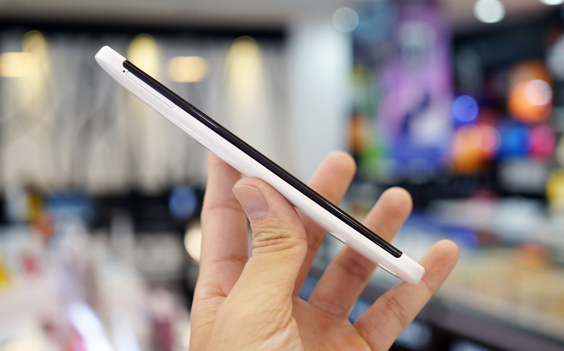 | Máy có mặt lưng vát cong, cạnh dưới là cổng microUSB và giắc cắm tai nghe 3,5 mm. |