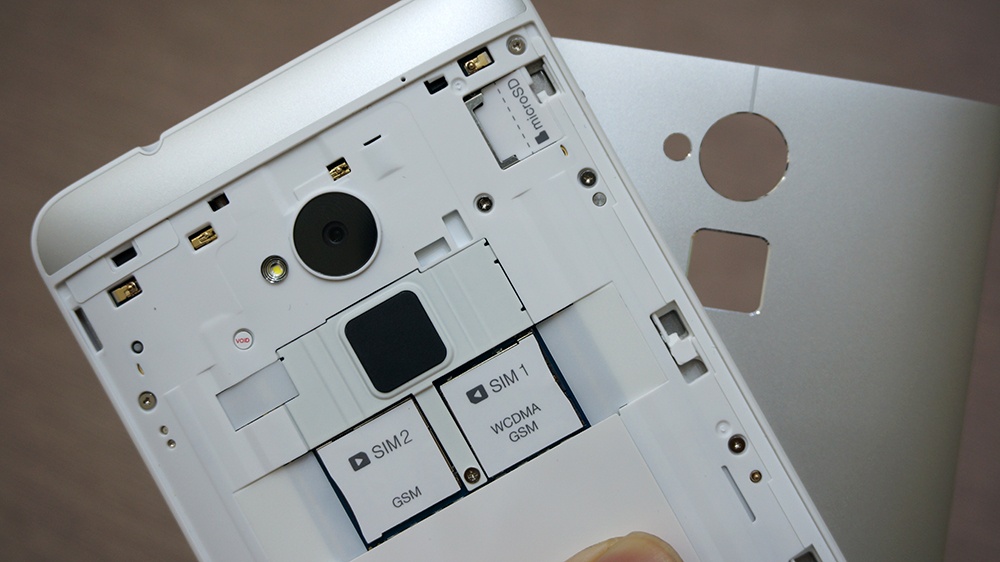 | Mặt sau của One Max 2 SIM cũng có cảm biến vân tay, cổng kết nối với dock sạc và Fipi cover. |