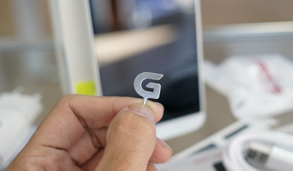| Máy có khe chọc sim khá độc đáo, mang biểu tượng của dòng G cao cấp. |
