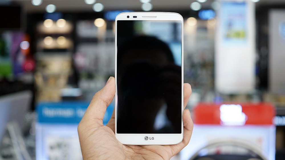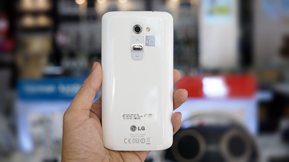 | Về thiết kế, LG G2 không khác so với bản 32 GB. Máy có màn hình 5,2 inch, viền màn hình rất mỏng. |