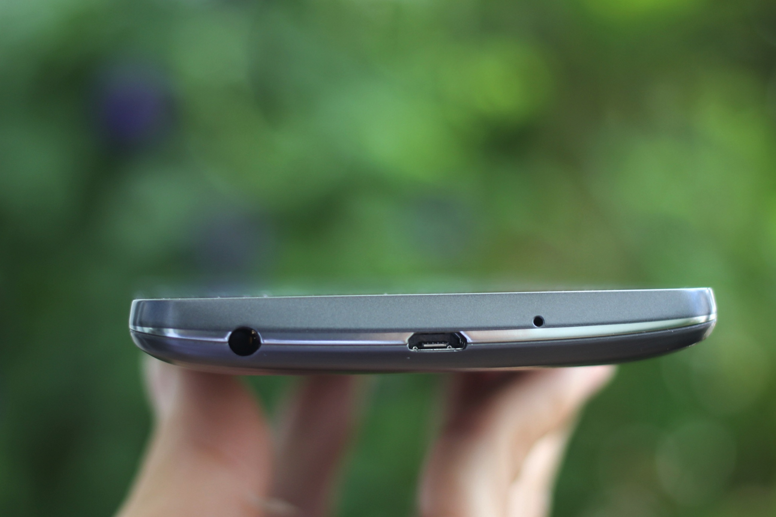 | Giắc cắm tai nghe và cổng micro USB nằm ở cạnh dưới của máy. |