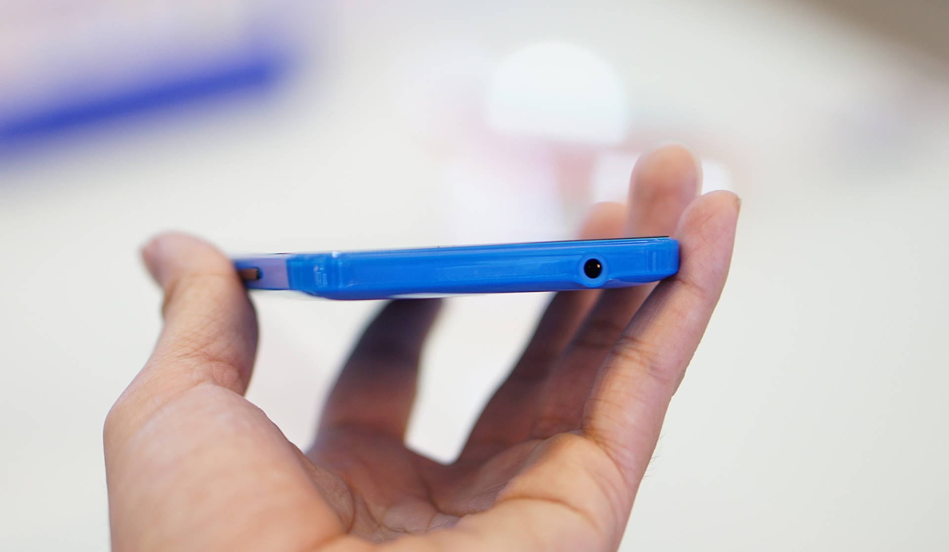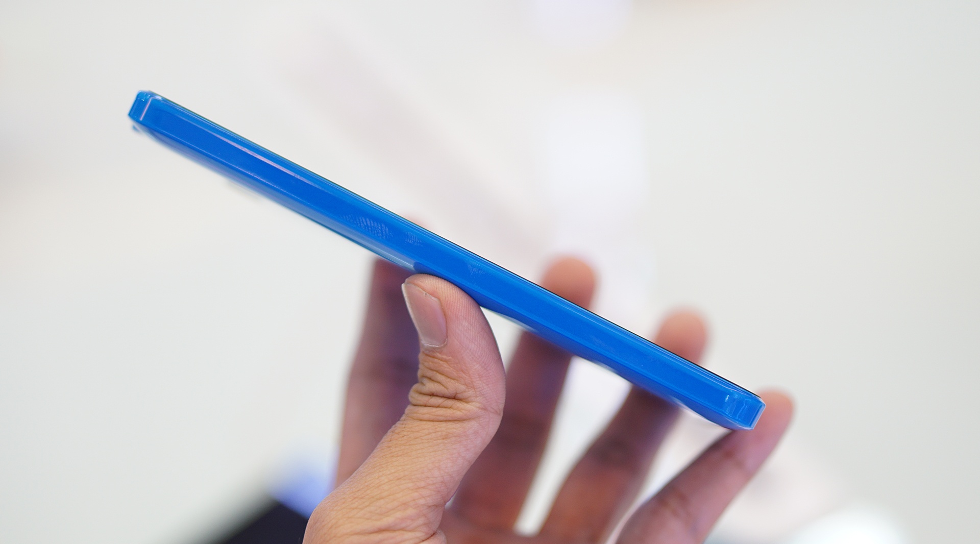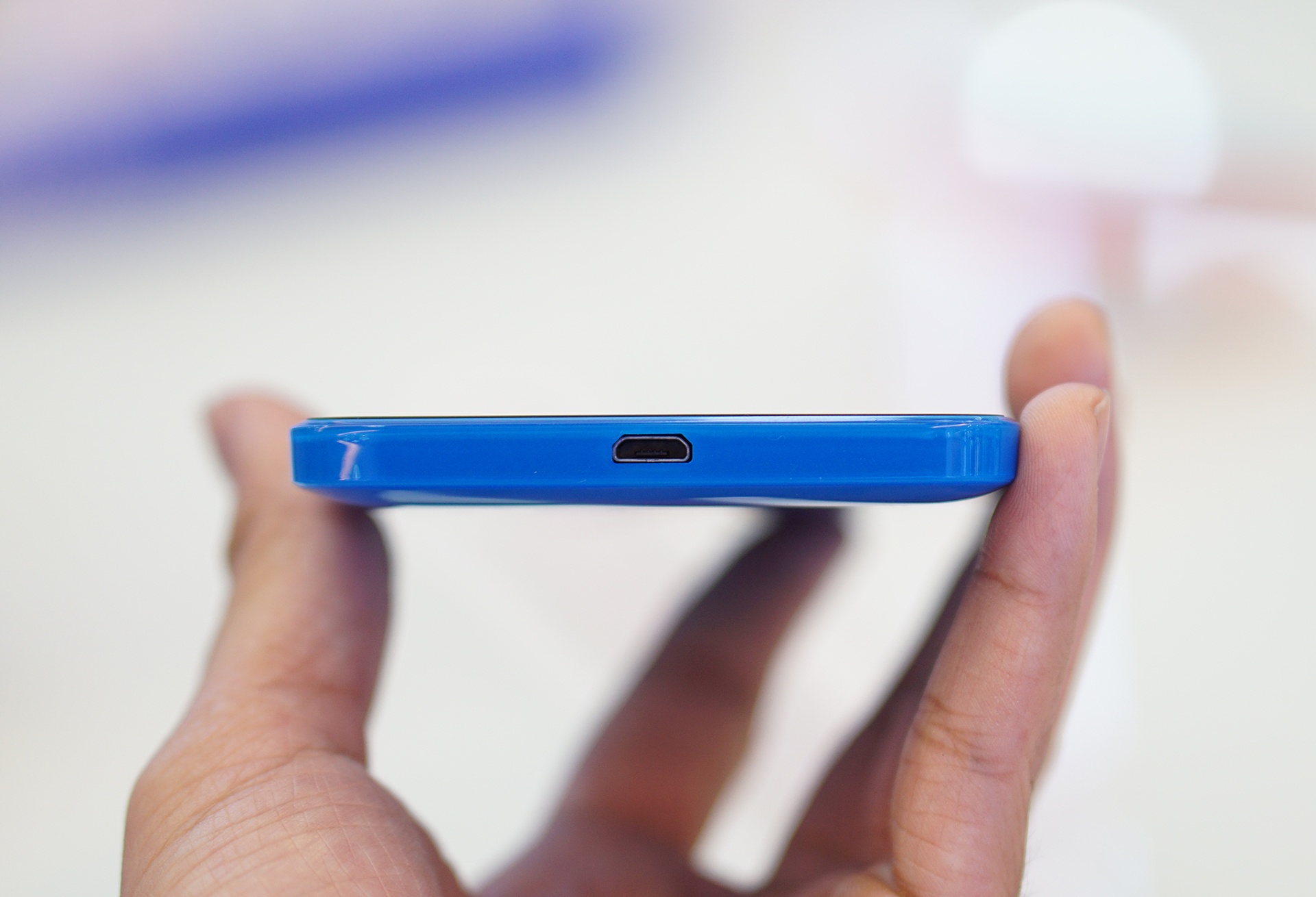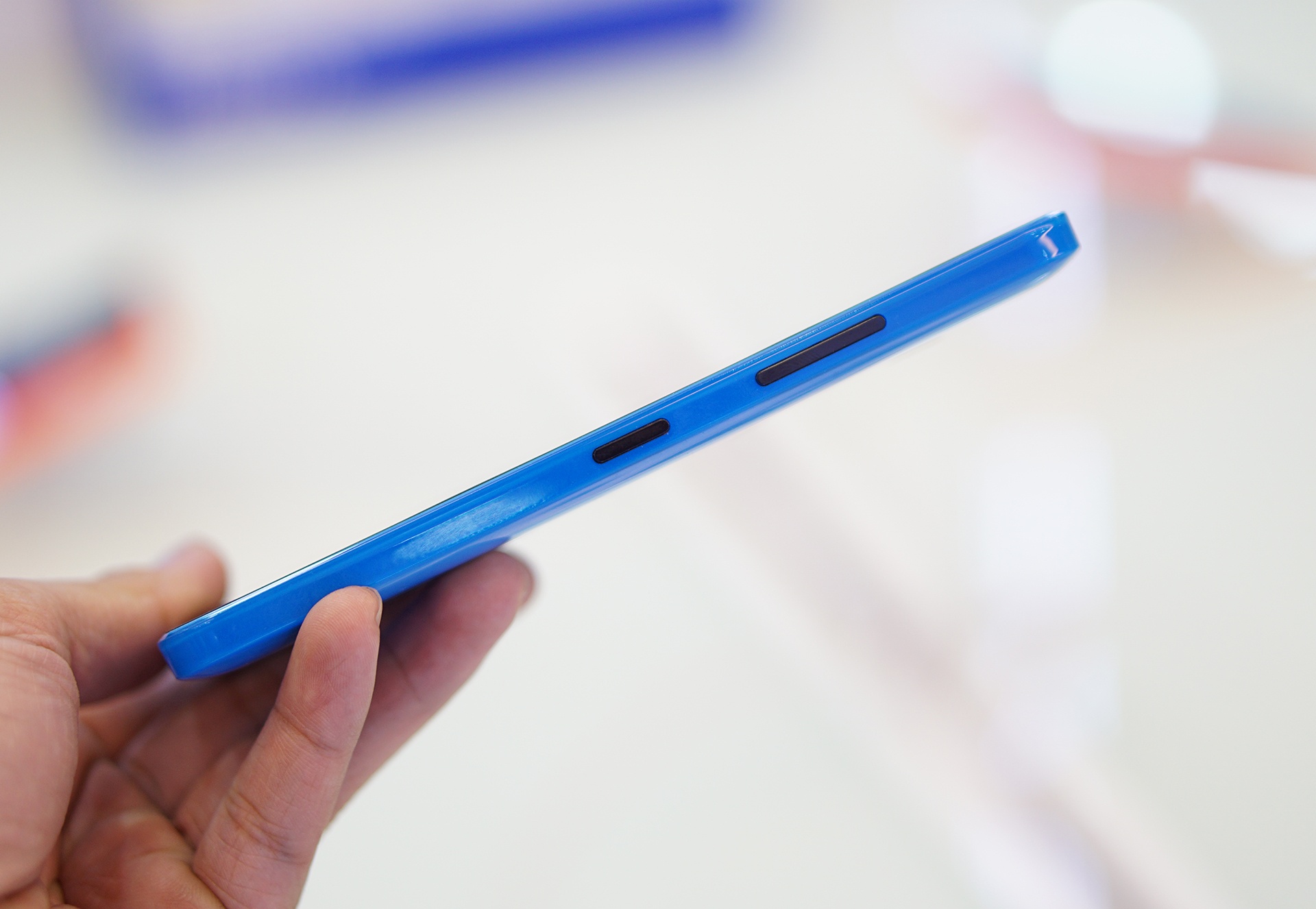 | Máy có độ dày 8,8 mm, khá mỏng so với mặt bằng chung các smartphone tầm giá thấp. Phím nguồn và âm lượng ở cạnh trái. Sản phẩm này không có phím chụp hình riêng như các model Lumia cao cấp. |