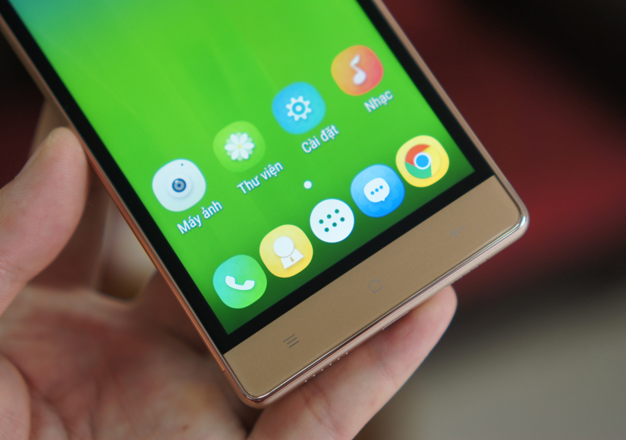 | Máy có 3 phím điều hướng cảm ứng đặt ngoài màn hình. Người dùng có thể tuỳ chọn 4 theme khác nhau để thay đổi. Trong ảnh là theme có tên Small Fresh. |