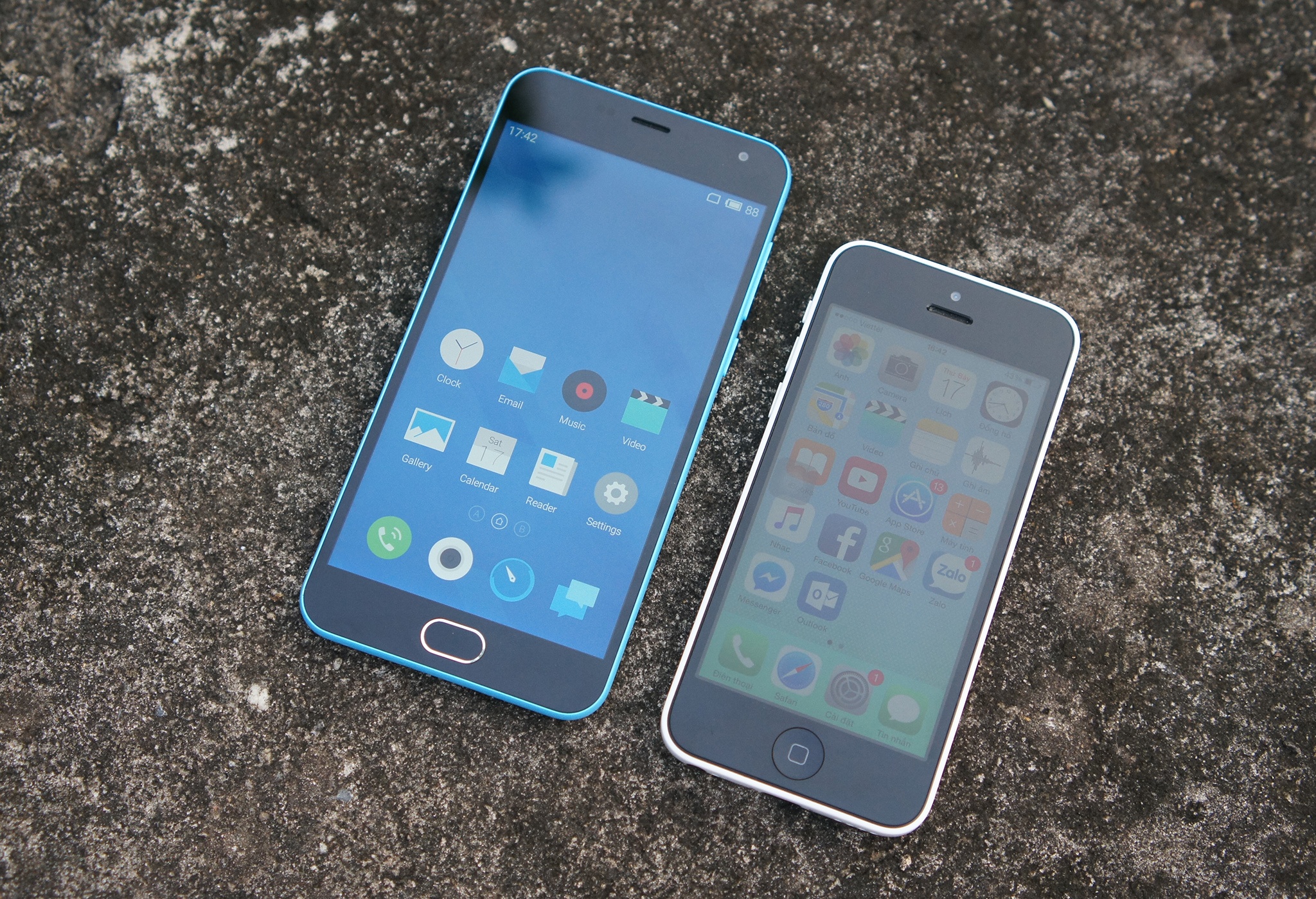 | Meizu M2 trông như một chiếc iPhone 5C phóng lớn khi đặt 2 máy cạnh nhau. |